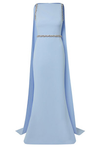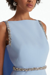 DETAILS AND INSIGHT Safiyaa ginevra gown in soft sky. Heavy Crepe: 92 % Polyester, 8 % Elastane Removable Belt Dry Clean Imported Style DL714.1E62+BE68.1E62-SOFT SKY/