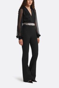 DETAILS AND INSIGHT Safiyaa hayall jumpsuit in black/gunmetal. 92% Polyester, 8% Elastane, 100% Polyester; Lining: 97% Polyester, 3% Lycra Dry Clean Made in Lithuania Style JS202.1E187-BLK/GNMTL