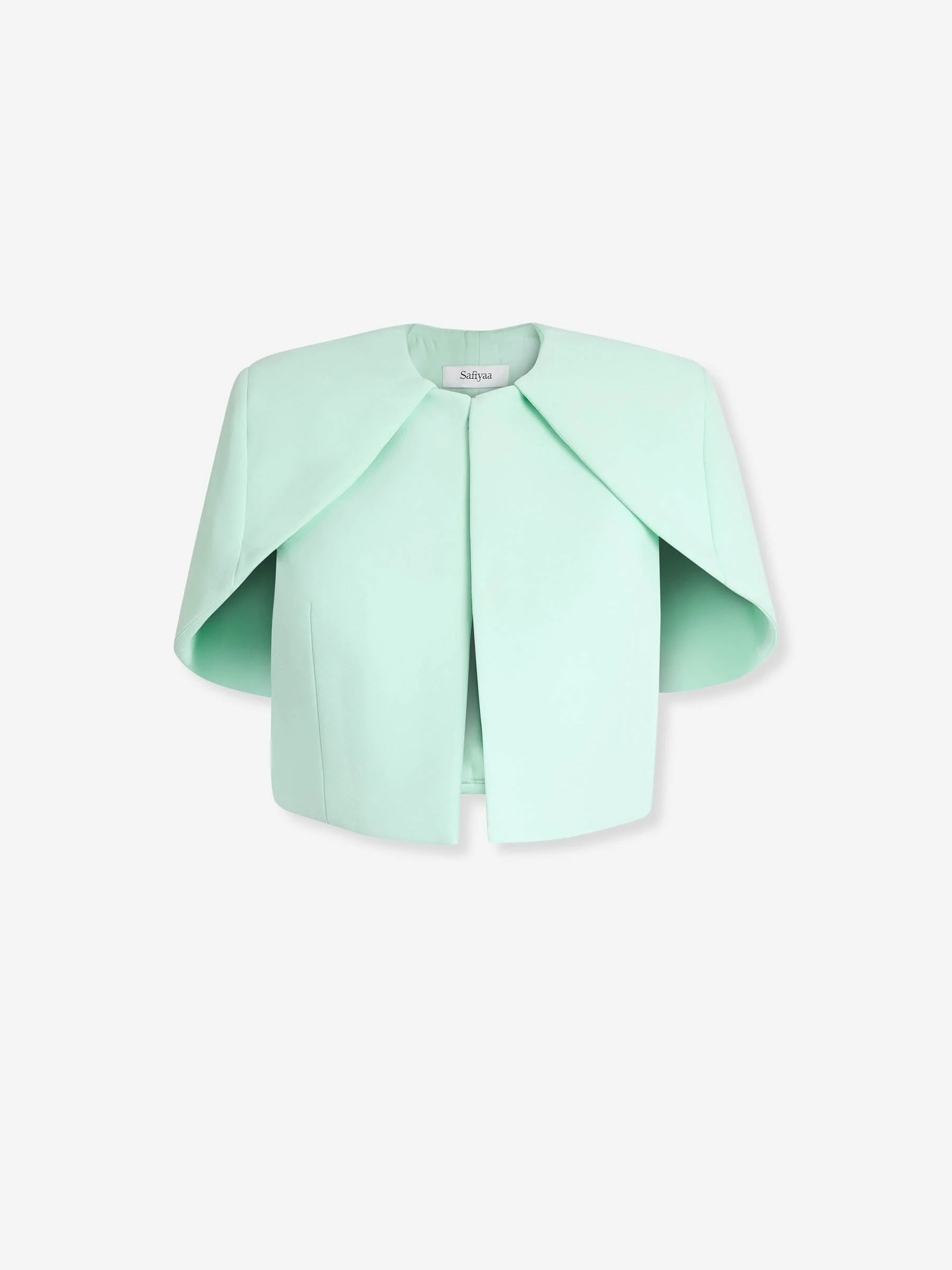 SKU: 771-001705 02 BRAND ID: C149.1 's Cloak By Safiyaa • Made from stretch polyester crepe • Short style • Front hook and eye closure • Structured shoulders • Composition: 92% polyester, 8% elastane. • Made in: United Arab Emirates