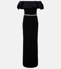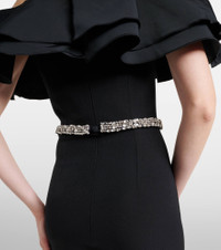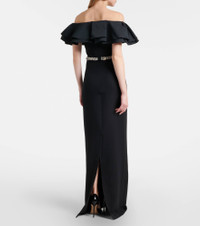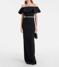 The Ryan gown has a column silhouette elevated with an off-the-shoulder ruffle detail and a crystal-embellished belt. This piece is made from Safiyaa's signature crepe – a fabric favored for its graceful draping qualities. Product Details - Material: 92% polyester, 8% elastane - Care instructions: dry clean - Made in Lithuania - Color: black - Designer color name: Black With Crystal - Trim: 100% polyester - Details: 80% glass, 20% metal - Boning - Closure: concealed zipped back - Detachable belt - Long vent - Item number: P01124139 Size & Fit - True to size - Off-the-shoulder - Internal boned corset for support - Fitted - Non-stretchy fabric - slit length 63cm-25" - The model seen in the picture is 178cm-5'10" and wearing a size FR 36