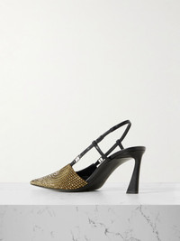 SAINT LAURENT's 'Andree' pumps are designed with gold satin pointed toes that are covered in sparkling crystals for plenty of glamour. They have elasticated leather slingback straps featuring silver-tone hardware and are set on sculptural 70mm heels. Size & Fit - Fits true to size, take your normal size - Italian sizing Details & Care - Heel measures approximately 70mm/ 3 inches - Gold satin, black leather (Lamb) - Elasticated slingback strap