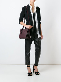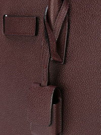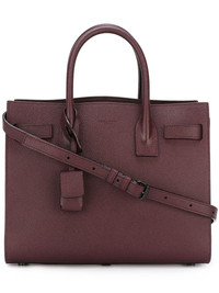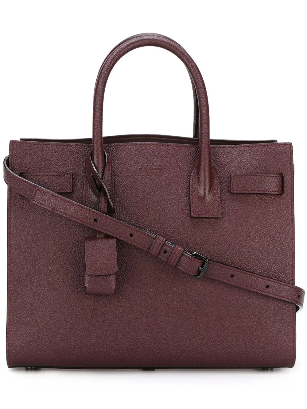 baby 'Sac de Jour' tote Burgundy calf leather baby 'Sac de Jour' tote from Saint Laurent featuring round top handles, a front centre logo stamp, a detachable and adjustable shoulder strap, gunmetal-tone hardware, a hanging leather tag, an open top design and an interior zipped compartment. Made in Italy Composition Calf Leather 100% SIZE & FIT Measurement WIDTH 10.23 in(26 cm) HEIGHT 7.87 in(20 cm) HANDLE 3.93 in(10 cm) DEPTH 4.33 in(11 cm) STRAP 24.01 in(61 cm)