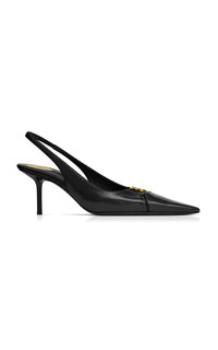 The French luxury house was founded in 1961 by Yves Saint Laurent and his partner, Pierre Berge. Today, creative director Anthony Vaccarello honors its legacy with a timeless (or hors du temps) offering. Slingback pumps with a low stiletto heel and cut-out elongated toe decorated with the Cassandre logo. PRODUCT DETAILS - Heel measures approximately 75mm / 3" - Elasticated slingback strap - Composition: calfskin leather, brass - Made in Italy