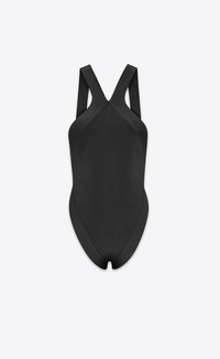 BACKLESS BODYSUIT MADE WITH RESPONSIBLE VISCOSE, FEATURING WIDE BANDED TRIM CROSSED AT THE FRONT NECK, BACK AND SIDES. - 89% VISCOSE, 10% POLYAMIDE, 1% ELASTANE - RESPONSIBLE VISCOSE - SNAP CLOSURE AT THE BOTTOM - CROSSED HALTER NECKLINE - DUE TO HYGIENE-RELATED REASONS, THIS PIECE MAY NOT BE RETURNED - STYLE ID 765457Y76JN1000 - MADE IN ITALY