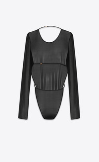 SEMI-SHEER BACKLESS BODYSUIT WITH A ROUND NECK, LONG SLEEVES, AND STRING BACK, FEATURING A HIGH-CUT LEG, ADJUSTABLE STRING WAIST AND BRIEF BOTTOM. - 90% SILK, 10% ELASTANE - SAINT LAURENT ENGRAVED CLASP CLOSURE AT THE WAIST - ROUND NECK - DUE TO HYGIENE-RELATED REASONS, THIS PIECE MAY NOT BE RETURNED - STYLE ID 791344Y37TE1000 - MADE IN ITALY