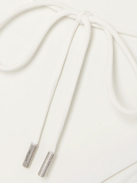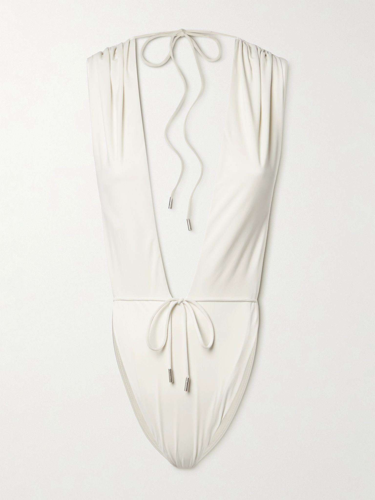 SAINT LAURENT's swimsuit has a plunging, naval-grazing neckline and an alluring open back framed by delicate ties. It's made from smooth stretch-jersey in white, so it'll stand out beautifully against blue skies in vacation shots. Size & Fit - Fits true to size, take your normal size - Minimal brief coverage - Model is 177cm/ 5'10", bra size 30A and is wearing a size Small Details & Care - White stretch-jersey - Ties at neck and back - 75% polyamide, 25% elastane - Machine wash