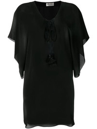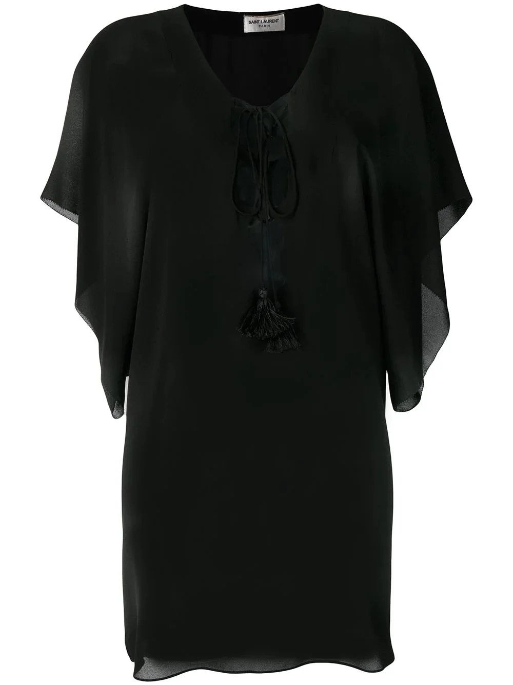 beach cover-up Yves Saint Laurent’s SS19 collection echoed a glam aesthetic; right down to its beachwear. This black beach cover-up from Saint Laurent features a tie fastening, a sheer construction, a hanging tassel and cut out details. Made in Italy Composition Viscose 100% Washing instructions Dry Clean Only