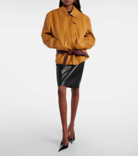 Since its conception in 1961, Saint Laurent has been coveted for its elegant Parisian aesthetic. Made from soft leather, this jacket features a classic silhouette enhanced by its oversized shoulders and contrast belt to cinch the waist. Product Details - Material: 100% lamb leather - Care instructions: specialist clean - Made in Italy - Designer color name: Chamois/Pourpre - Item color: yellow - Details: 100% lamb leather - Lining: 100% silk - Pocket lining: 100% cotton - Contains non-textile parts of animal origin - Closure: zipped front - Pockets: welt pockets, internal pocket - Cuff: buttoned - Detachable belt - Includes: garment bag - Item number: P01086649 Size & Fit - True to size - Shoulder pad inserts - Designed for a loose fit - Non-stretchy fabric - Falls below the hip - Height of model is 174cm-68.5" and wears a size FR 34