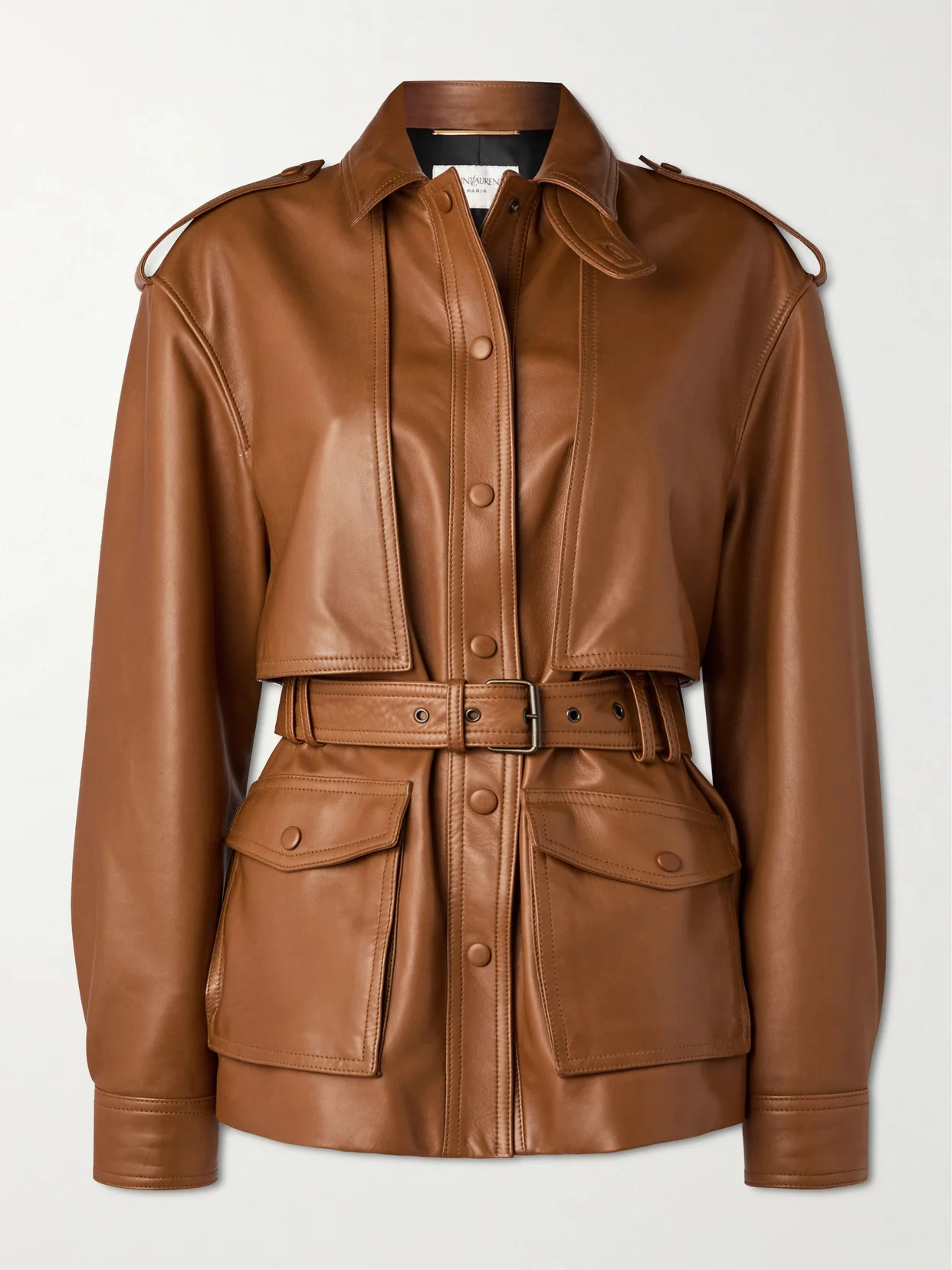 SAINT LAURENT's jacket has a retro-inspired, utilitarian feel. Crafted in Italy from supple leather, it features shoulder epaulettes, generous storm flaps and buttoned pockets. Use the belt to cinch the shape.
