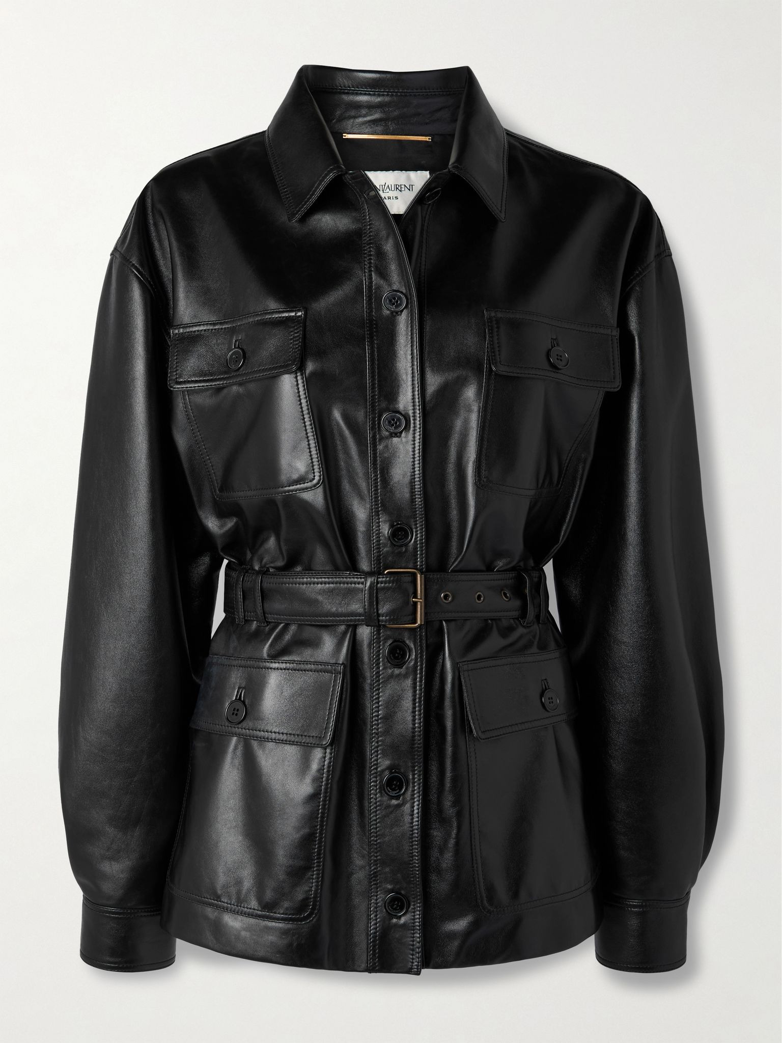 Inspired by archival utilitarian styles from the '60s, SAINT LAURENT’s jacket has sizable flap pockets and a belt to define the slightly loose shape. It's made from supple leather that ensures an undeniably elevated feel and fully lined for smooth, comfortable layering. Size & Fit - Fits true to size, take your normal size - Designed for a slightly loose fit, use the belt to cinch in at the waist - Supple, non-stretchy leather - Model is 177cm/ 5'10" and is wearing a FR 36 Model measurements: - Bust: 81cm/ 32” - Waist: 66cm/ 26” - Hip: 90cm/ 35.5” Details & Care - Black leather - Button fastenings through front - 100% leather (Lamb); lining1: 100% cotton; lining2: 100% silk