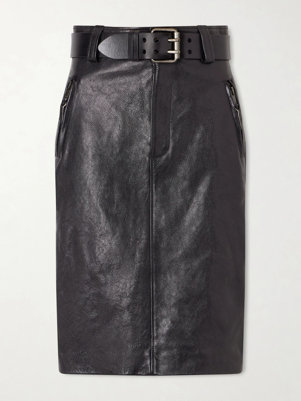 SAINT LAURENTs midi skirt combines the brand's rock 'n' roll attitude with a touch of elegance. Crafted from textured-leather, it has a pencil silhouette topped with a belted waist and includes two slit pockets. Style yours with pointed pumps and a silky blouse.
