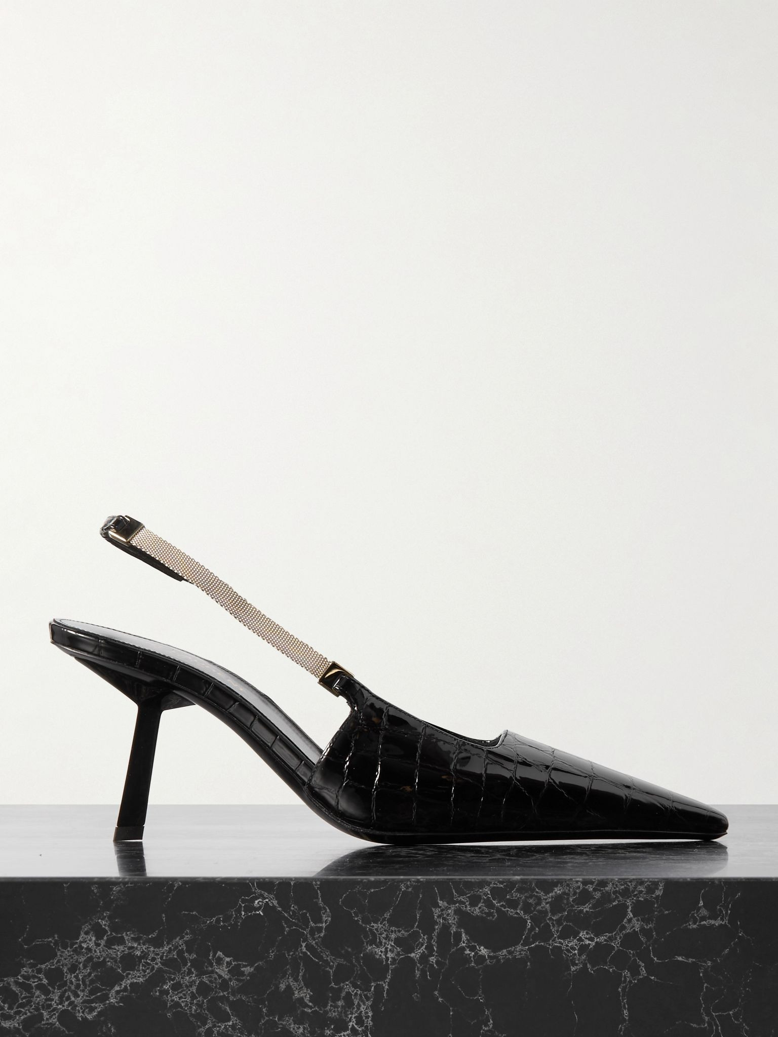 SAINT LAURENT's 'Blake' pumps are an instant way to elevate your outfit. They're crafted from glossy croc-effect leather and rest on angular heels that mirror the square vamps and pointed toes. Match your accessories to the gold-tone mesh straps. Size & Fit Fits true to size, please refer to SAINT LAURENT size guide below: - EU 36 = UK 3/ US 6/ IT 36/ FR 37 - EU 36.5 = UK 3.5/ US 6.5/ IT 36.5/ FR 37.5 - EU 37 = UK 4/ US 7/ IT 37/ FR 38 - EU 37.5 = UK 4.5/ US 7.5/ IT 37.5/ FR 38.5 - EU 38 = UK 5/ US 8/ IT 38/ FR 39 - EU 38.5 = UK 5.5/ US 8.5/ IT 38.5/ FR 39.5 - EU 39 = UK 6/ US 9/ IT 39/ FR 40 - EU 39.5 = UK 6.5/ US 9.5/ IT 39.5/ FR 40.5 - EU 40 = UK 7/ US 10/ IT 40/ FR 41 - EU 40.5 = UK 7.5/ US 10.5/ IT 40.5/ FR 41.5 - EU 41 = UK 8/ US 11/ IT 41/ FR 42 - EU 41.5 = UK 8.5/ US 11.5/ IT 41.5/ FR 42.5 - EU 42 = UK 9/ US 12/ IT 42/ FR 43 Details & Care - Heel measures approximately 75mm/ 3 inches - Black croc-effect leather (Calf) - Slip on