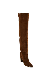 Boots Saint Laurent model 76 in brown suede. Decorative gold studs all around. Thick 11 cm high heel. Pointed toe. Leather insole and outsole. 100% calf leather. Made in Italy.