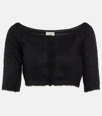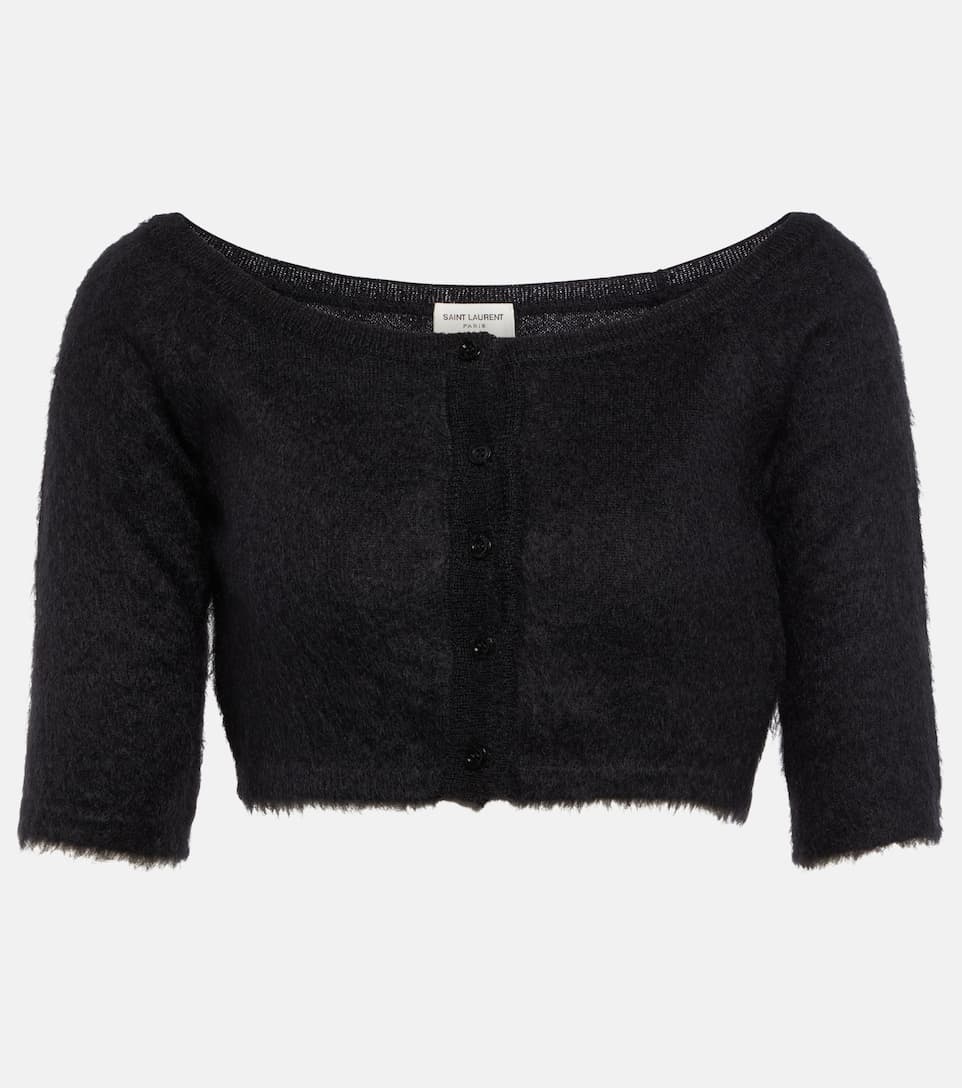 Equal parts cozy and contemporary, keep warm with this Saint Laurent cardigan. Made from a brushed mohair and wool blend, this cropped style has a wide boat neck, mid-length sleeves, and tonal buttons. Product Details - Made in Italy - Material: 67% mohair, 28% polyamide, 5% wool - Closure: buttoned front - Designer color name: Noir - Care instructions: dry clean - Item number: P00776447 Size & Fit - True to size - Off-the-shoulder - Fitted - Mid-weight material - Cropped - The model seen in the picture is 178cm-5'10" and wearing a size XS