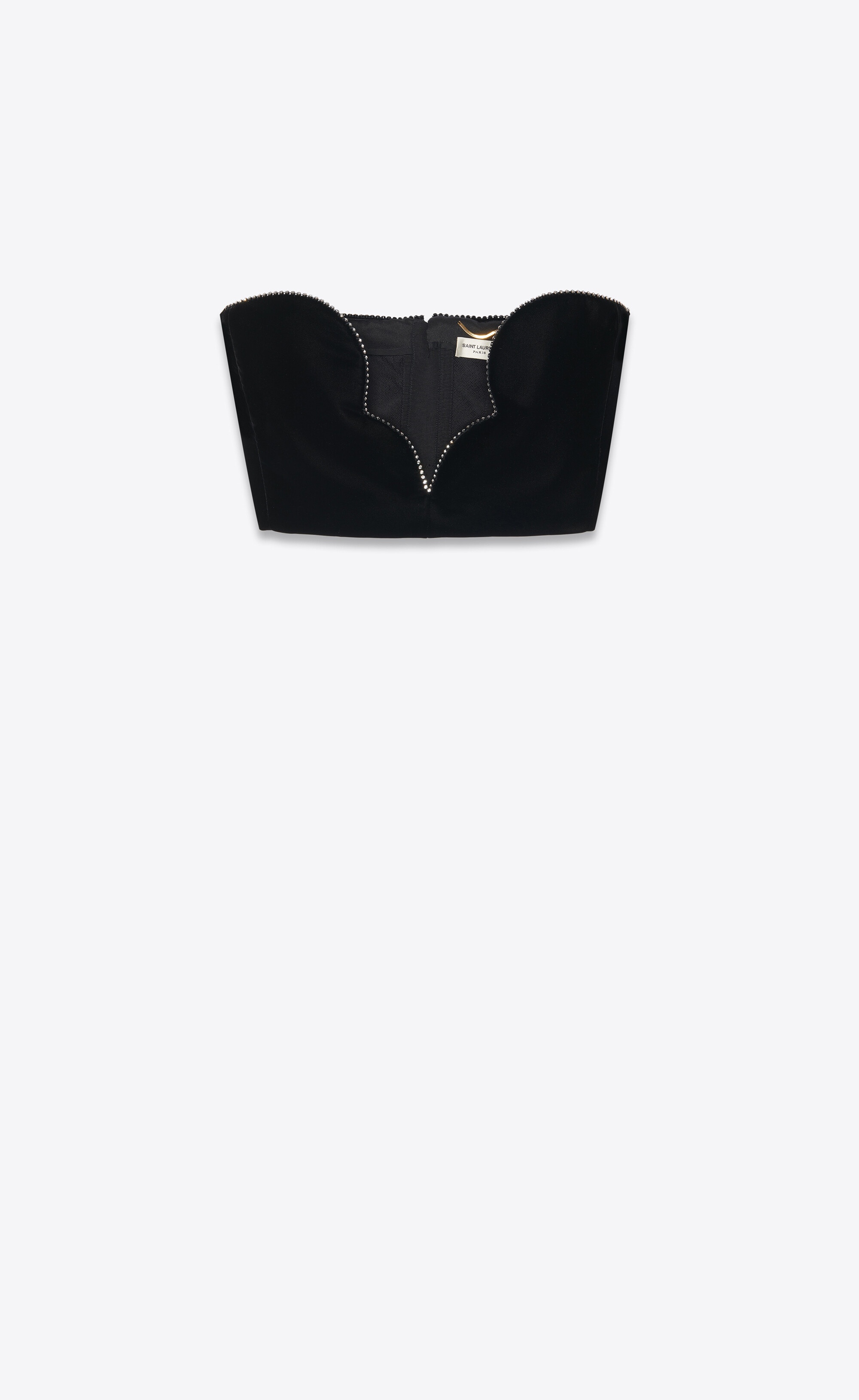 STRAPLESS BUSTIER MADE WITH VISCOSE FROM CERTIFIED SUSTAINABLY MANAGED FORESTS AND RECYCLED CUPRO WITH SCALLOPED EDGING AND ZIP CLOSURE AT THE BACK, DECORATED WITH RHINESTONES ON THE NECKLINE. - 65% VISCOSE, 35% CUPRO - VISCOSE FROM CERTIFIED SUSTAINABLY MANAGED FORESTS AND RECYCLED CUPRO - SILK LINING - ZIP CLOSURE AT THE BACK - SCALLOPED V-NECK - STYLE ID 691608Y525R1000 - MADE IN FRANCE