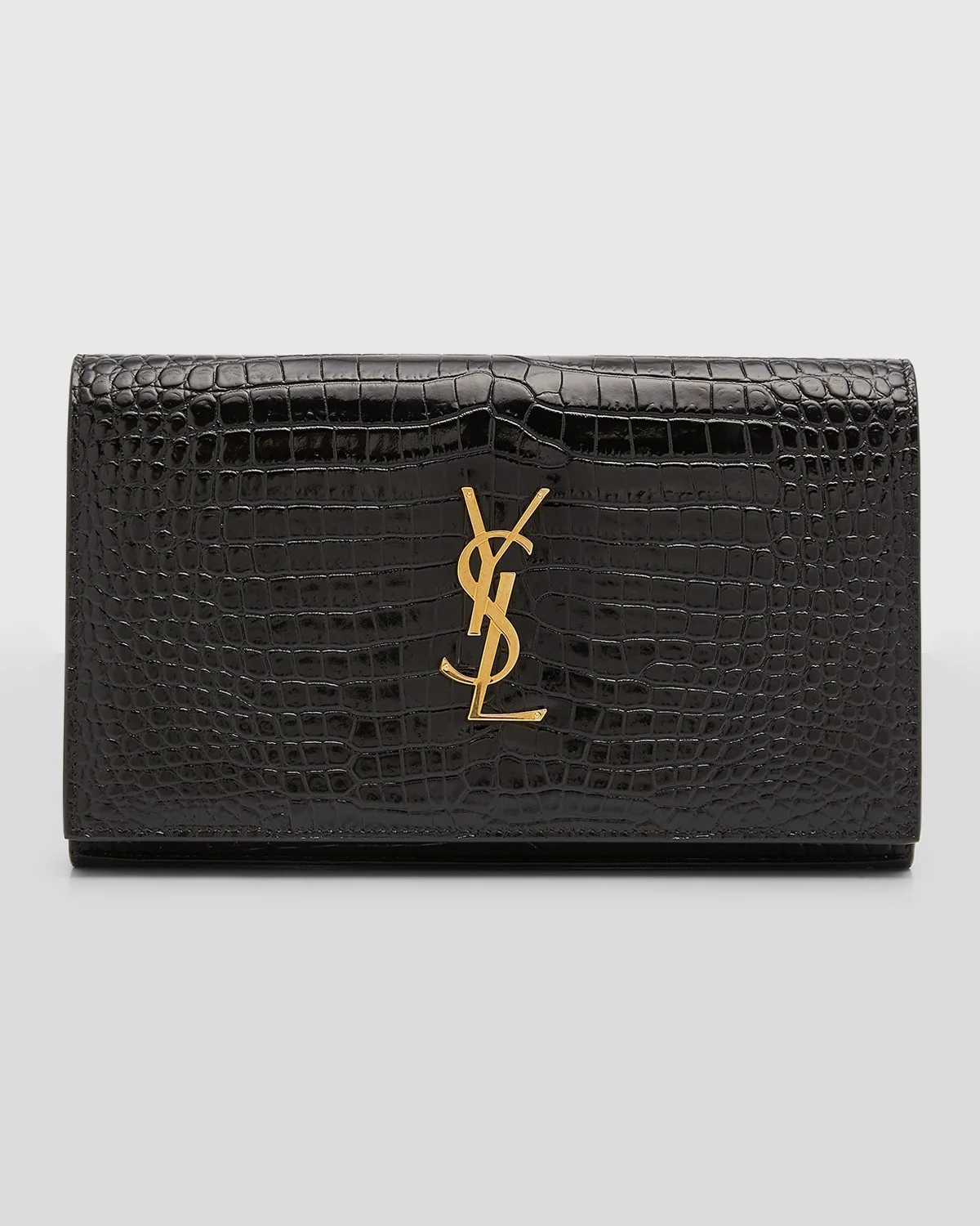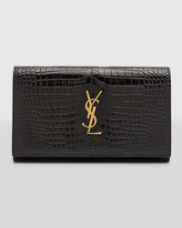 - Saint Laurent wallet in croc-embossed calf leather - Features YSL logo lettering - Detachable chain shoulder strap - Can be worn as a shoulder bag or wallet - Flap top with snap closure - Golden hardware - Center zip compartment divides interior; six card slots and one slip pocket - Approx. 10.6"H x 6.3"W x 0.8"D - Made in Italy