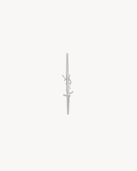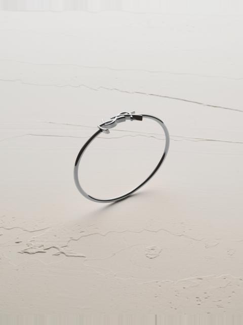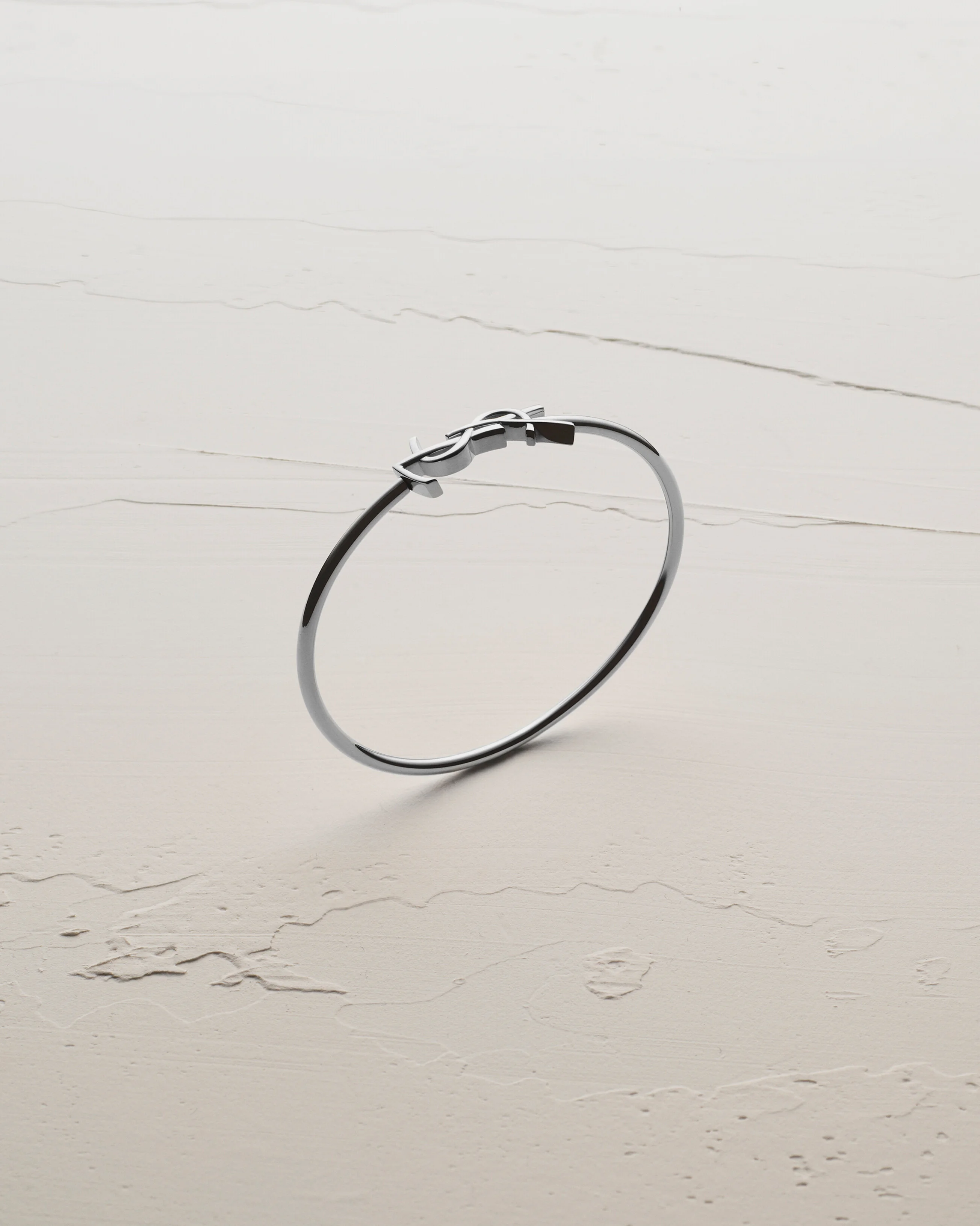 THIN BANGLE MADE WITH RECYCLED GOLD, ADORNED WITH A HORIZONTAL CASSANDRE AT THE CENTER. GOLD IS A PRECIOUS MATERIAL THAT IS MALLEABLE AND HIGHLY SENSITIVE TO SCRATCHING. THE PRODUCT IS EXPECTED TO EVOLVE AND PRESENT MARKS THROUGHOUT ITS LIFECYCLE. MOREOVER, AS GOLD IS A SOFT ALLOY, PIECES SHOULD NOT BE STACKED ONE ON TOP OF THE OTHER TO AVOID DAMAGING THEM. EVERY PIECE OF JEWELRY MUST BE STORED IN ITS ORIGINAL PACKAGING TO AVOID ANY FRICTION WITH OTHER OBJECTS THAT COULD SCRATCH IT. WHEN PART OF A SET, PIECES MUST BE STOCKED SEPARATELY. - RECYCLED GOLD - SLIDE-ON BRACELET - SAINT LAURENT ENGRAVING ON THE INSIDE - DIAMETER: SIZE S 61 MM / 2.4 INCHES; SIZE M 63 MM / 2.5 INCHES - 18KT GREY GOLD 750/1000 - STYLE ID 770088Y80028126 - MADE IN FRANCE