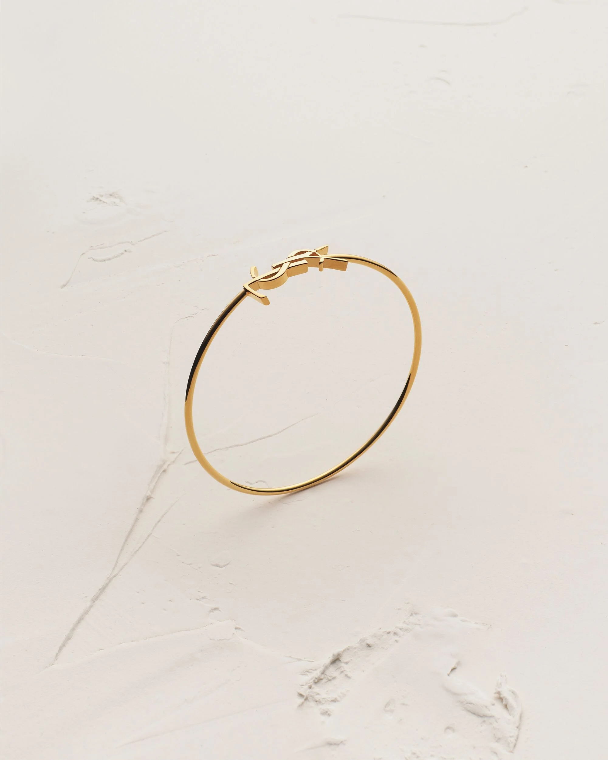 THIN BANGLE MADE WITH RECYCLED GOLD, ADORNED WITH A HORIZONTAL CASSANDRE AT THE CENTER. GOLD IS A PRECIOUS MATERIAL THAT IS MALLEABLE AND HIGHLY SENSITIVE TO SCRATCHING. THE PRODUCT IS EXPECTED TO EVOLVE AND PRESENT MARKS THROUGHOUT ITS LIFECYCLE. MOREOVER, AS GOLD IS A SOFT ALLOY, PIECES SHOULD NOT BE STACKED ONE ON TOP OF THE OTHER TO AVOID DAMAGING THEM. EVERY PIECE OF JEWELRY MUST BE STORED IN ITS ORIGINAL PACKAGING TO AVOID ANY FRICTION WITH OTHER OBJECTS THAT COULD SCRATCH IT. WHEN PART OF A SET, PIECES MUST BE STOCKED SEPARATELY. - RECYCLED GOLD - SLIDE-ON BRACELET - SAINT LAURENT ENGRAVING ON THE INSIDE - DIAMETER: SIZE XS 59 MM / 2.3 INCHES; SIZE S 61 MM / 2.4 INCHES; SIZE M 63 MM / 2.5 INCHES; SIZE L 65 MM / 2.6 INCHES - 18KT YELLOW GOLD 750/1000 - STYLE ID 770088Y80158030 - MADE IN FRANCE