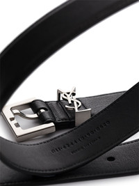 monogram-plaque buckled belt Good news, Saint Laurent is here to bring a stop to your nudity-based nightmares and renew your faith in your trousers with this belt and its monogram plaque buckle fastening. No more waking up in a cold sweat for you, sweet dreams. Highlights - Black - Leather - Signature cassandre logo plaque - Buckle fastening - Adjustable fit - Silver-tone hardware Made in Italy Composition Leather 100% SIZE & FIT Model measurements Height 6 ft 2 in(1.87 m) Bust/Chest 38.18 in(97 cm) Hips 36.61 in(93 cm) Waist 29.13 in(74 cm) Measurement Minimum Length 31.49 in(80 cm) TOTAL LENGTH 35.43 in(90 cm) WIDTH 1.18 in(3 cm)