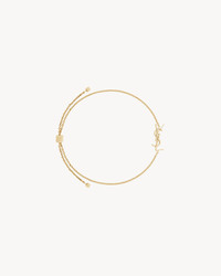 ADJUSTABLE BRACELET MADE WITH RECYCLED GOLD, ADORNED WITH A CASSANDRE CHARM. GOLD IS A PRECIOUS MATERIAL THAT IS MALLEABLE AND HIGHLY SENSITIVE TO SCRATCHING. THE PRODUCT IS EXPECTED TO EVOLVE AND PRESENT MARKS THROUGHOUT ITS LIFECYCLE. MOREOVER, AS GOLD IS A SOFT ALLOY, PIECES SHOULD NOT BE STACKED ONE ON TOP OF THE OTHER TO AVOID DAMAGING THEM. EVERY PIECE OF JEWELRY MUST BE STORED IN ITS ORIGINAL PACKAGING TO AVOID ANY FRICTION WITH OTHER OBJECTS THAT COULD SCRATCH IT. WHEN PART OF A SET, PIECES MUST BE STOCKED SEPARATELY. - RECYCLED GOLD - ADJUSTABLE SLIDING CLASP - SAINT LAURENT ENGRAVING ON THE INSIDE OF THE CHARM - DIMENSIONS: SIZE XS 19 CM / 7.5 INCHES; SIZE S 21 CM / 8.3 INCHES; SIZE M 23 CM / 9 INCHES; SIZE L 25 CM / 9.8 INCHES - 18KT YELLOW GOLD 750/1000 - STYLE ID 797489Y80158030 - MADE IN ITALY