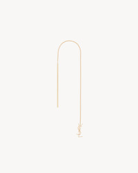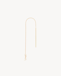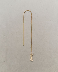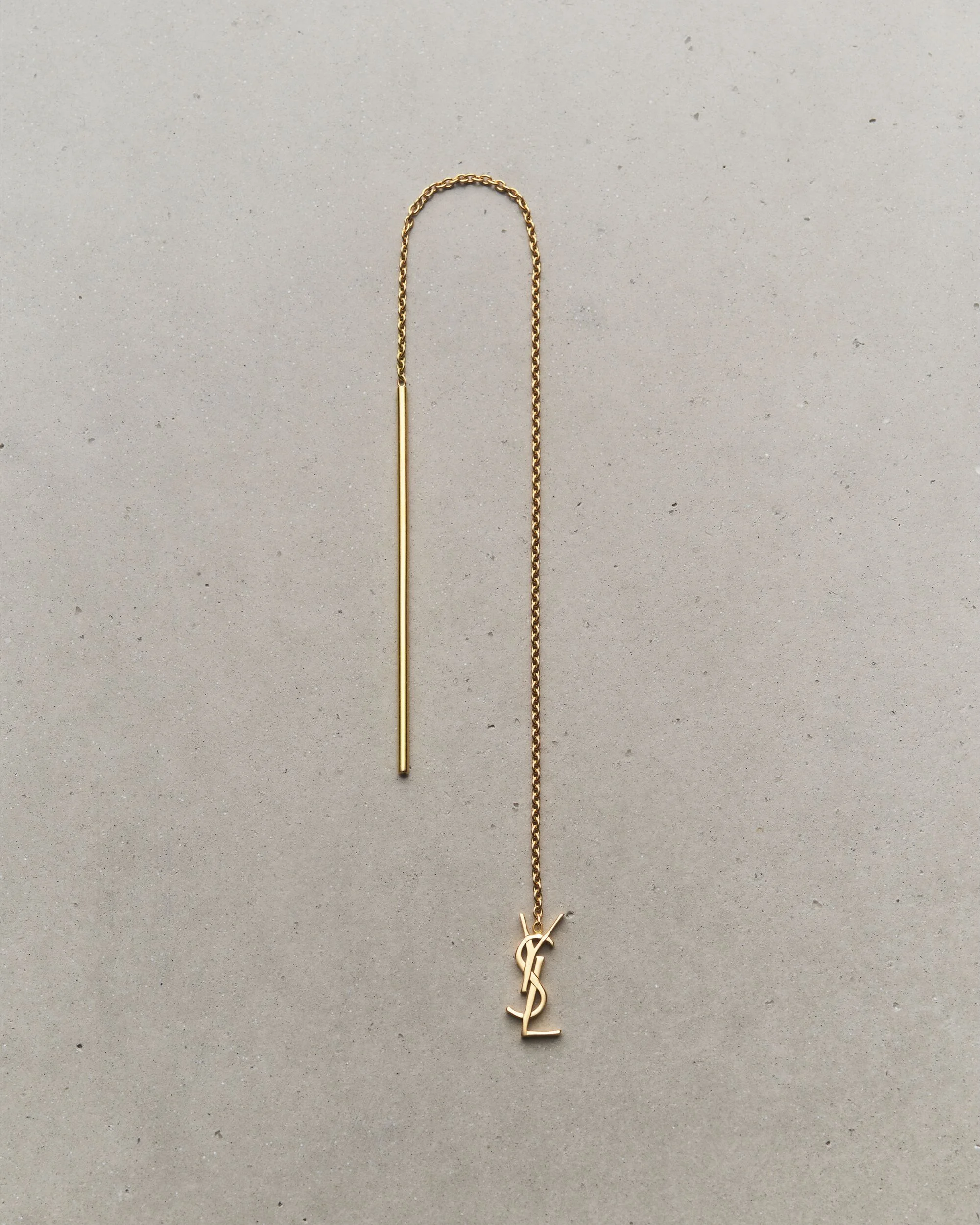 LONG THREADER SINGLE EARRING MADE WITH RECYCLED GOLD, FEATURING A FINE CHAIN AND CASSANDRE PENDANT. GOLD IS A PRECIOUS MATERIAL THAT IS MALLEABLE AND HIGHLY SENSITIVE TO SCRATCHING. THE PRODUCT IS EXPECTED TO EVOLVE AND PRESENT MARKS THROUGHOUT ITS LIFECYCLE. MOREOVER, AS GOLD IS A SOFT ALLOY, PIECES SHOULD NOT BE STACKED ONE ON TOP OF THE OTHER TO AVOID DAMAGING THEM. EVERY PIECE OF JEWELRY MUST BE STORED IN ITS ORIGINAL PACKAGING TO AVOID ANY FRICTION WITH OTHER OBJECTS THAT COULD SCRATCH IT. WHEN PART OF A SET, PIECES MUST BE STOCKED SEPARATELY. - RECYCLED GOLD - EARRING FOR PIERCED EARS - SAINT LAURENT ENGRAVING ON THE INSIDE OF THE CHARM - LENGTH: 16 CM / 6.3 INCHES - 18KT YELLOW GOLD 750/1000 - STYLE ID 761530Y80158030 - MADE IN FRANCE