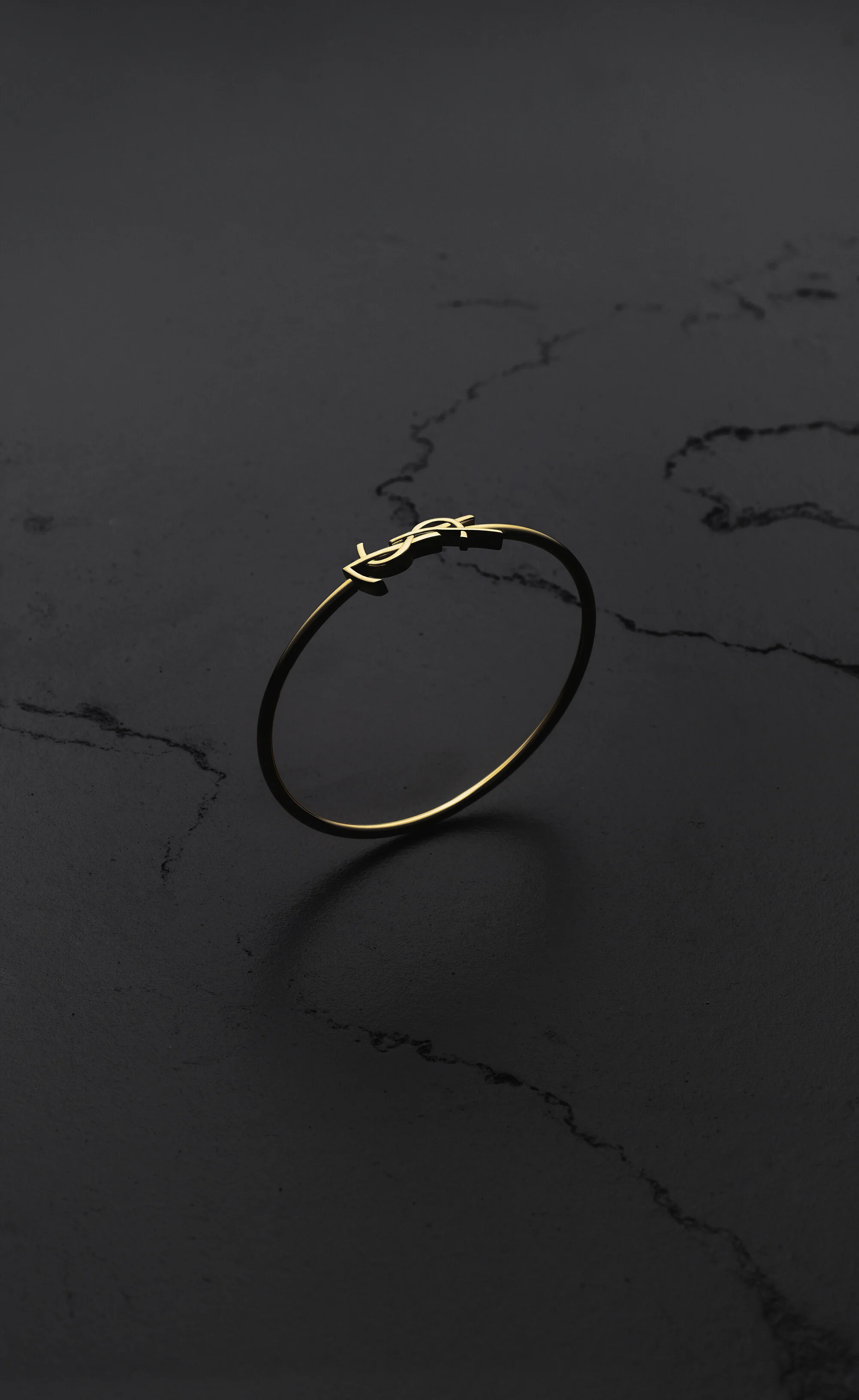 THIN HINGED BANGLE MADE WITH RECYCLED GOLD, ADORNED WITH A HORIZONTAL CASSANDRE AT THE CENTER. GOLD IS A PRECIOUS MATERIAL THAT IS MALLEABLE AND HIGHLY SENSITIVE TO SCRATCHING. THE PRODUCT IS EXPECTED TO EVOLVE AND PRESENT MARKS THROUGHOUT ITS LIFECYCLE. MOREOVER, AS GOLD IS A SOFT ALLOY, PIECES SHOULD NOT BE STACKED ONE ON TOP OF THE OTHER TO AVOID DAMAGING THEM. EVERY PIECE OF JEWELRY MUST BE STORED IN ITS ORIGINAL PACKAGING TO AVOID ANY FRICTION WITH OTHER OBJECTS THAT COULD SCRATCH IT. WHEN PART OF A SET, PIECES MUST BE STOCKED SEPARATELY. - RECYCLED GOLD - HINGED CLASP - SAINT LAURENT ENGRAVING ON THE INSIDE - DIMENSIONS: SIZE S 58 X 47 MM / 2.3 X 1.8 INCHES; SIZE M 60 X 48 MM / 2.4 X 1.9 INCHES; SIZE L 62 X 48 MM / 2.4 X 1.9 INCHES - 18KT GREY GOLD 750/1000 - STYLE ID 797515Y80158030 - MADE IN ITALY