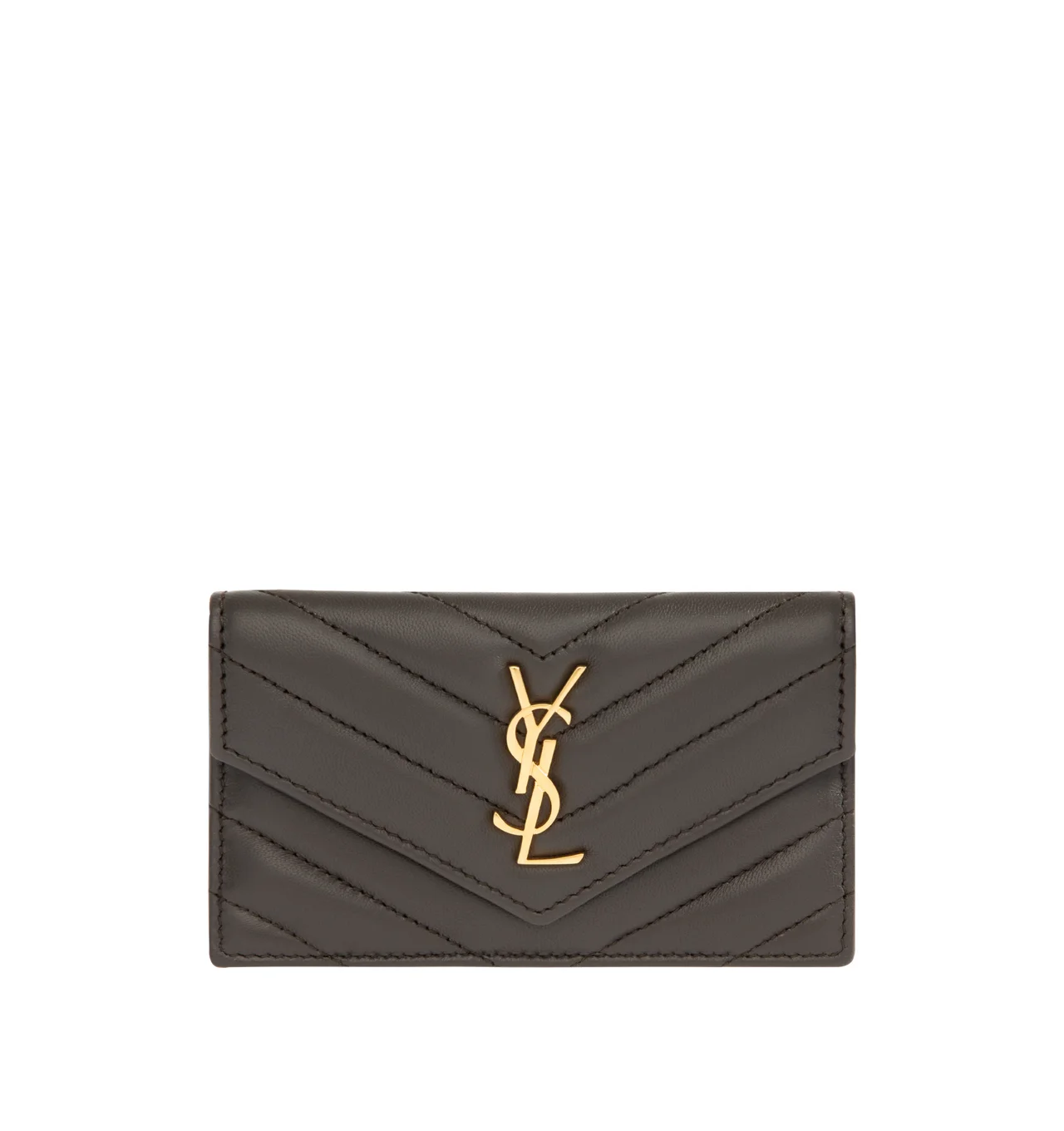 SAINT LAURENT Zip Card Case with flap in soft nappa leather, decorated with the CASSANDRE and chevron-quilted topstitching, leather lining, gold-toned hardware, snap-button closure, one zip coin pocket and five card slots. 5.1" x 3.1" x 0.7". Calfskin leather. Made in Italy. DESIGNER STYLE ID: 612808-AAA44 COLOR: 1997 URBAN CHIC