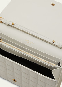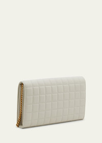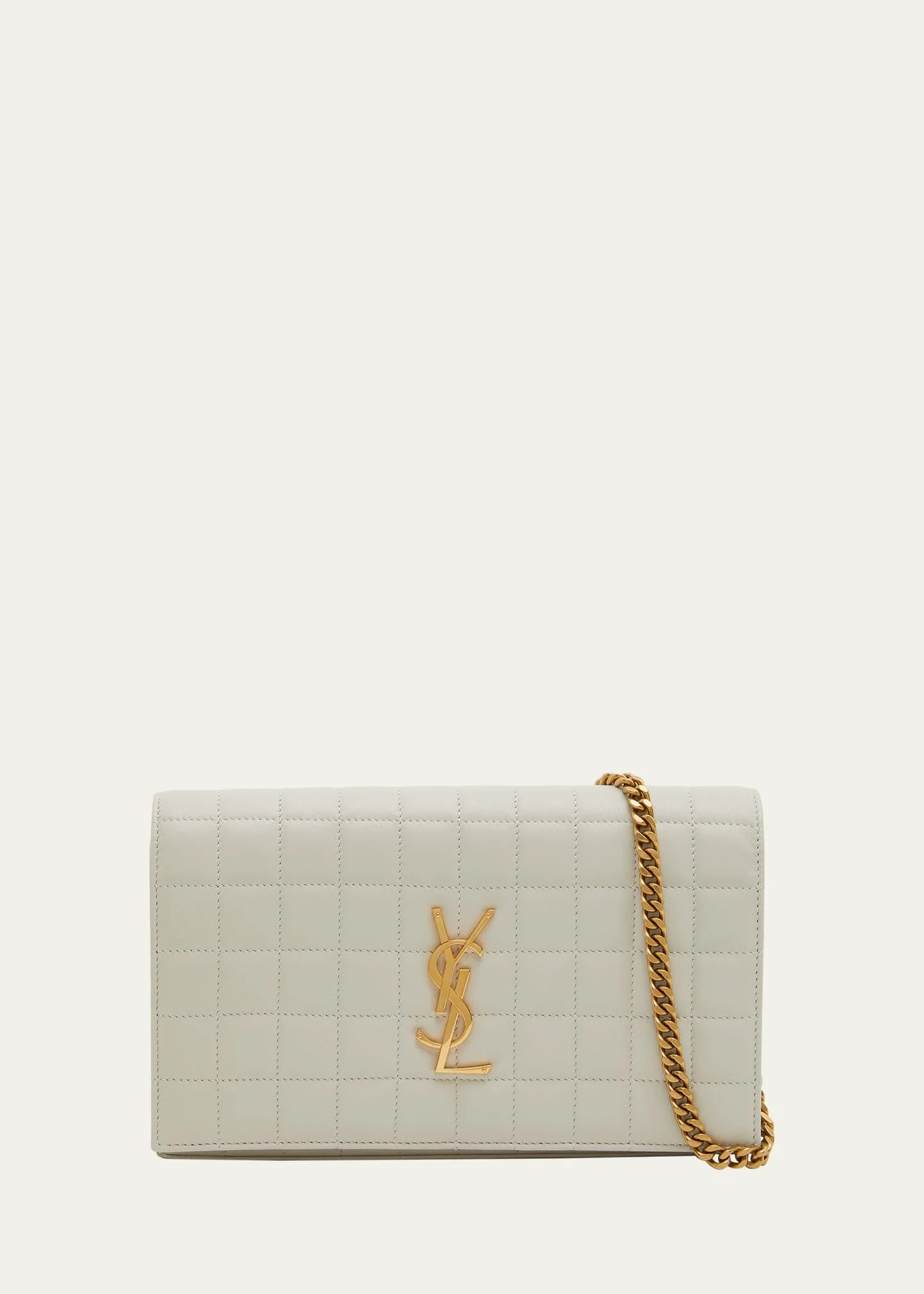 Saint Laurent quilted lambskin leather wallet on chain Detachable chain shoulder strap Can be worn on the shoulder or across the body Signature YSL medallion on fold-over flap top Interior zip compartment and 8 card slots Snap button closure Approx. 9.1"L x 5.5"W x 1.2"D "Cassandra" is made in Italy Online Inquiries: BGS21_V5UMH| Store Inquiries: #4527710