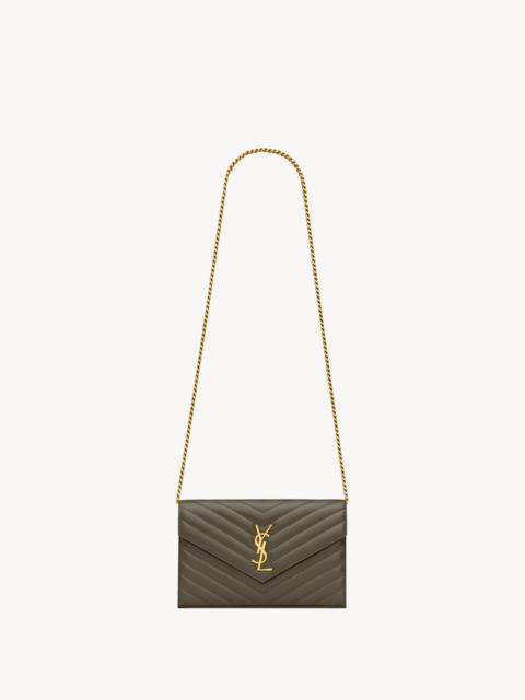 TIMELESS CHAIN PURSE WITH CASSANDRE EMBELLISHMENT AND ICONIC CHEVRON QUILTING. THIS PRACTICAL ACCESSORY FEATURES TWO LARGE COMPARTMENTS, A ZIPPER POCKET AND CARD SLOTS. IT CAN BE CARRIED IN THE HAND AS A CLUTCH OR ON THE SHOULDER WITH ITS DETACHABLE CHAIN. - GROSGRAIN LINING - GOLD-TONED BRASS HARDWARE - MAGNETIC SNAP TAB - TEN CARD SLOTS - BILL SLOT - TWO CENTRAL COMPARTMENTS - ONE INTERIOR ZIPPED POCKET - DIMENSIONS: 22.5 X 14 X 4 CM /8.9 X 5.5 X 1.6 INCHES - CHAIN LENGTH: 48 CM /18.9 INCHES - LAMBSKIN - STYLE ID 377828AAA441000 - MADE IN ITALY