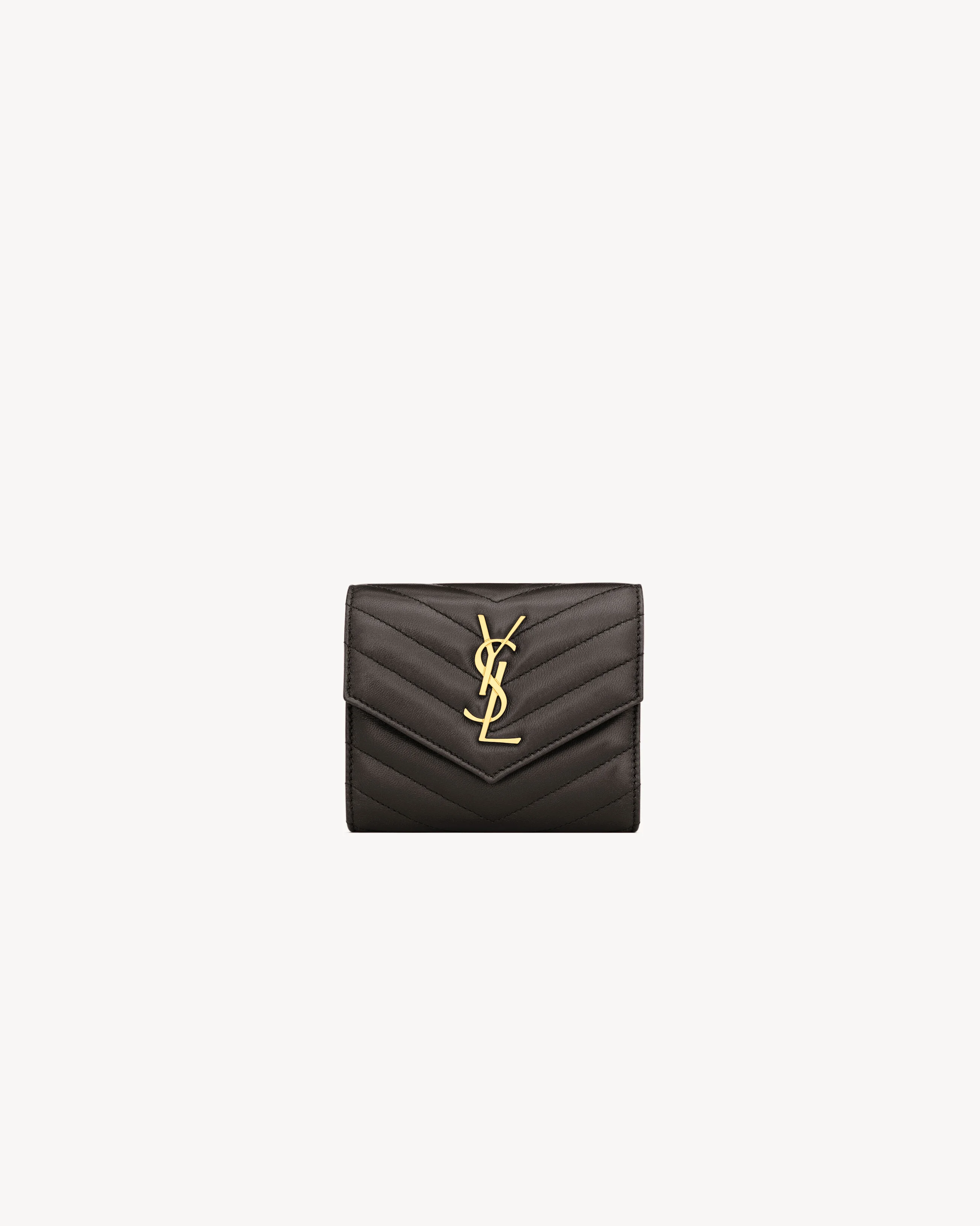 COMPACT TRI-FOLD WALLET DECORATED WITH THE CASSANDRE AND QUILTED OVERSTITCHING. - DIMENSIONS: 12,5 X 10 X 2,5 CM / 4.9 X 3.9 X 0.9 INCHES - GOLD-TONED METAL HARDWARE - SNAP BUTTON CLOSING - OUTSIDE SLIT POCKET ON BACK - SIX CARD SLOTS, ONE ZIPPED COIN POCKET - ONE BILL COMPARTMENT AND FOUR RECEIPT COMPARTMENTS - LEATHER LINING - LAMBSKIN - STYLE ID 403943AAA441997 - MADE IN ITALY