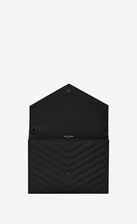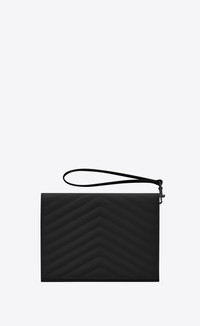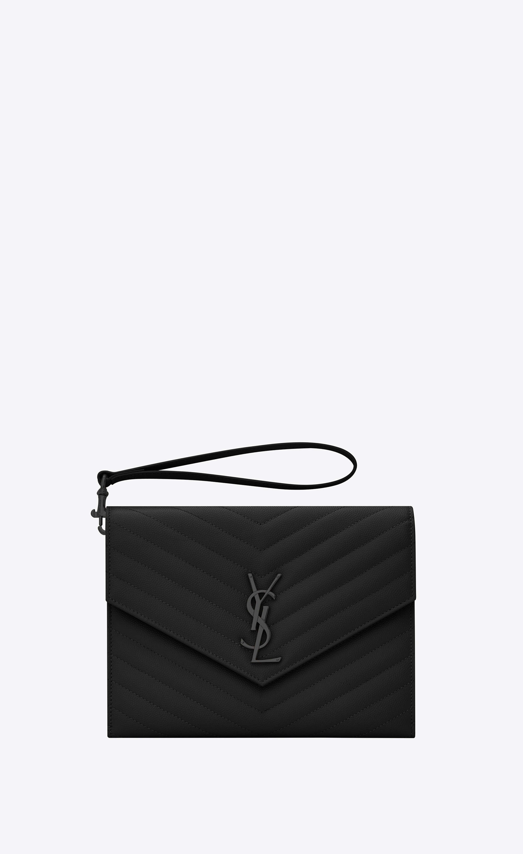 ENVELOPE POUCH MADE WITH METAL-FREE TANNED LEATHER WITH A FRONT FLAP, DECORATED WITH ICONIC YSL SIGNATURE AND CHEVRON-QUILTED OVERSTITCHING, FEATURING A DETACHABLE WRISTLET. - 100% CALFSKIN LEATHER - DIMENSIONS: 21 X 16 X 3 CM / 8.2 X 6.2 X 1.1 INCHES - MATTE BLACK-TONED METAL HARDWARE - SNAP-BUTTON CLOSURE - EXTERIOR: DETACHABLE WRISTLET - INTERIOR: ONE MAIN COMPARTMENT, ONE FLAT POCKET - ORGANIC COTTON LINING - STYLE ID 810866046 - MADE IN ITALY