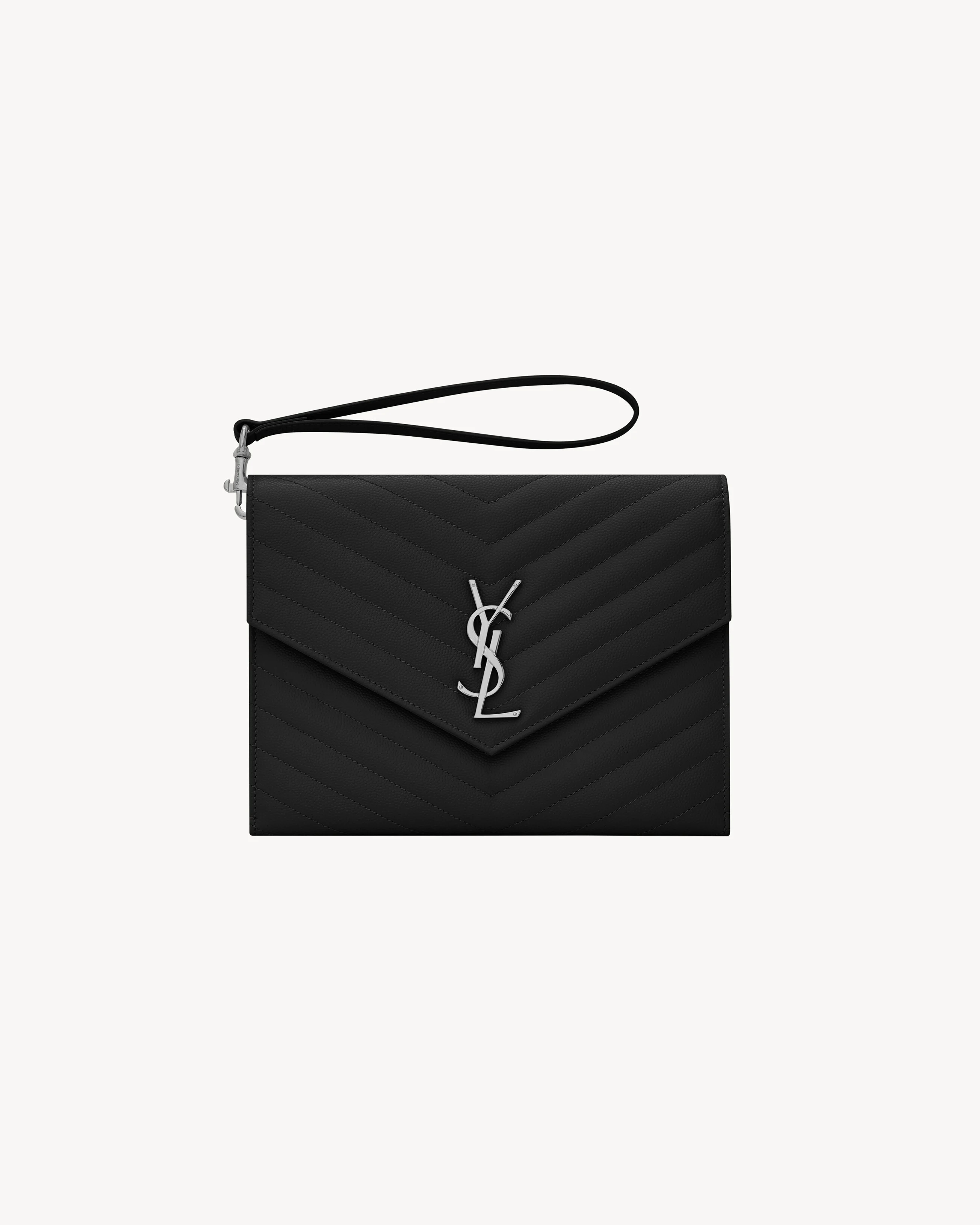 ENVELOPE POUCH WITH A FRONT FLAP MADE WITH METAL-FREE TANNED LEATHER AND ORGANIC COTTON LINING, DECORATED WITH THE CASSANDRE AND CHEVRON-QUILTED OVERSTITCHING, FEATURING A DETACHABLE WRISTLET. - CHROME FREE, METAL FREE TANNED LEATHER AND ORGANIC COTTON LINING - DIMENSIONS: 21 X 16 X 3 CM / 8.2 X 6.2 X 1.1 INCHES - HANDLE DROP: 14 CMSILVER-TONED METAL HARDWARE - SNAP-BUTTON CLOSURE - INTERIOR: ONE MAIN COMPARTMENT, ONE FLAT POCKET - CALFSKIN LEATHER - STYLE ID 617662BOW021000 - MADE IN ITALY