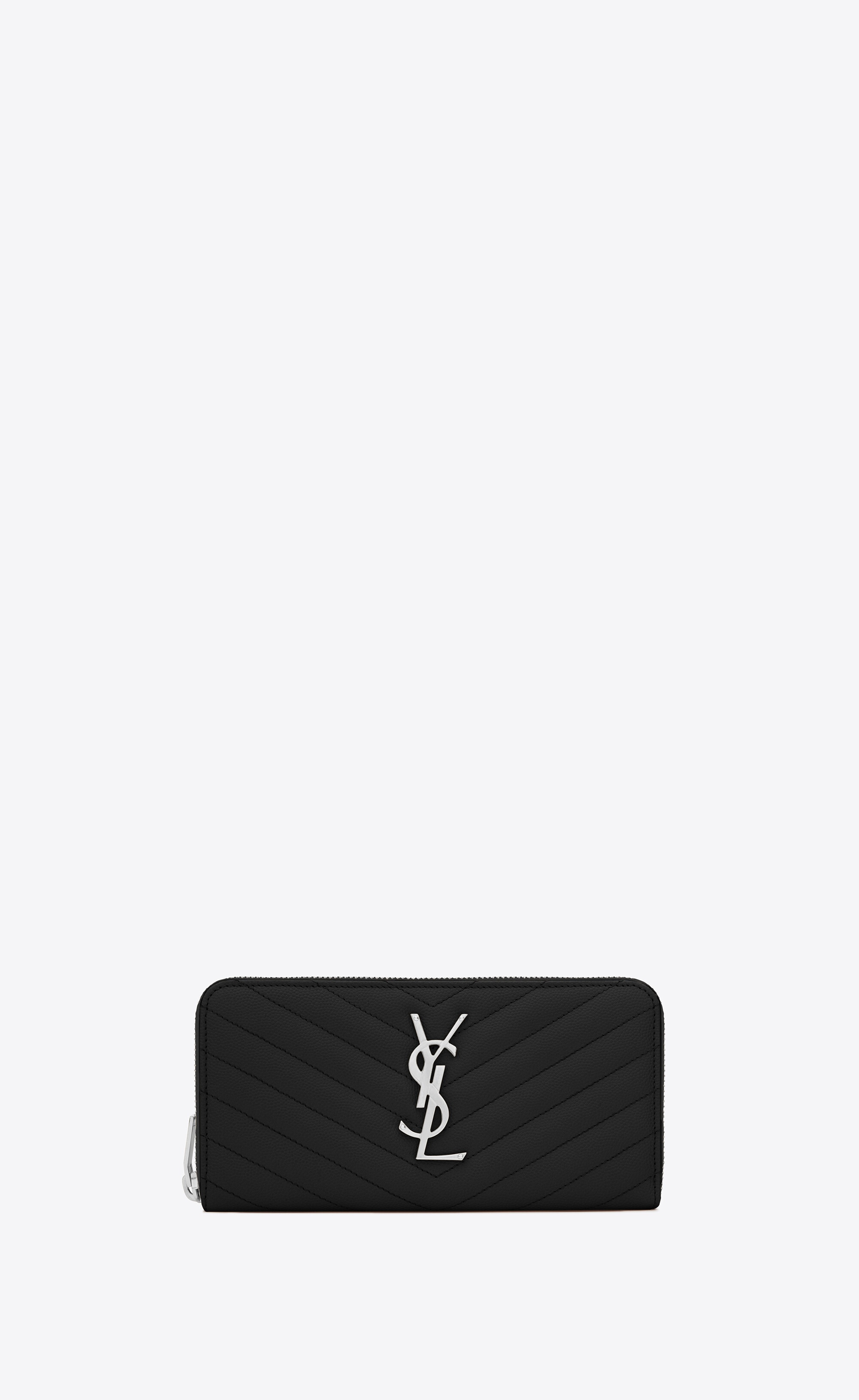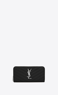 MONOGRAM SAINT LAURENT ZIP AROUND WALLET MADE WITH METAL-FREE TANNED LEATHER, FEATURING A METAL INTERLOCKING YSL SIGNATURE AND MATELASSÉ STITCHING. - 100% CALFSKIN LEATHER - CHROME FREE AND METAL FREE TANNED LEATHER - DIMENSIONS: 19 X 9,5 X 2,5 CM / 7.4 X 3.7 X 0.9 INCHES - ZIP AROUND CLOSURE - SILVER-TONED HARDWARE - 12 CARD SLOTS, 1 ZIP POCKET - 2 BILL, 2 RECEIPT COMPARTMENTS - STYLE ID 806450476 - MADE IN ITALY