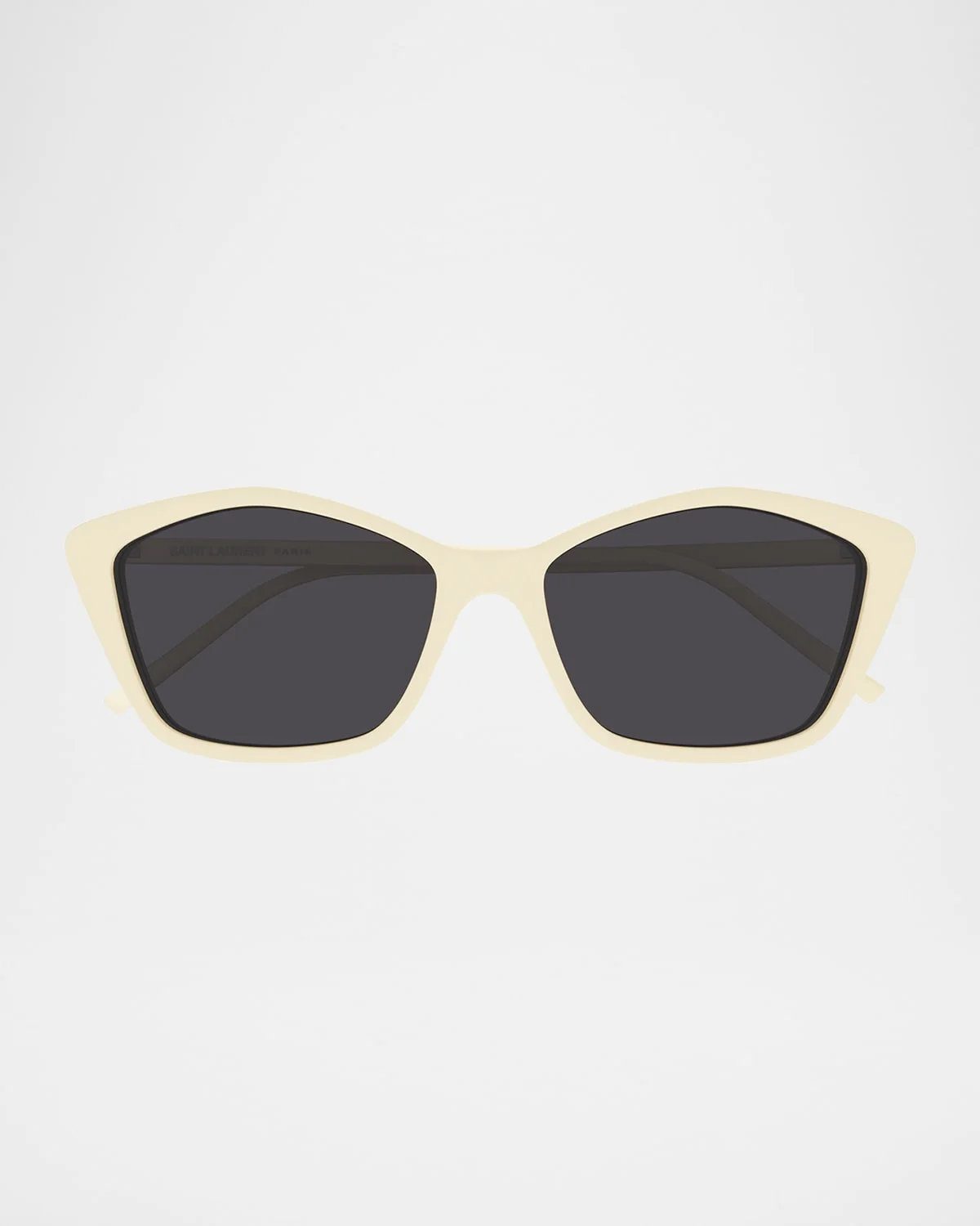 - Saint Laurent cat-eye sunglasses in acetate - Eye/bridge/temple (in mm): 57-17-145 - Solid lenses - Saddle nose bridge - Thin, tapered arms - Logo printed at temples - Acetate - 100% UVA/UVB protection - Made in Italy - Proposition 65 warning for California residents