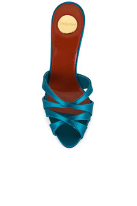 Details - Saint Laurent Chandelle Mule Sandal in Silk Duck Blue - Made in Italy - Slip-on styling - Leather lining - Leather insole and sole - Pointed open toe - Engraved metal plaque on the insole - Approx 3.7 inch heel - This item is not available to ship to Indonesia - Our Style No. SLAU-WZ1522 - Manufacturer Style No. 844417-9QN00-4415
