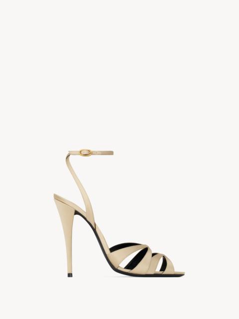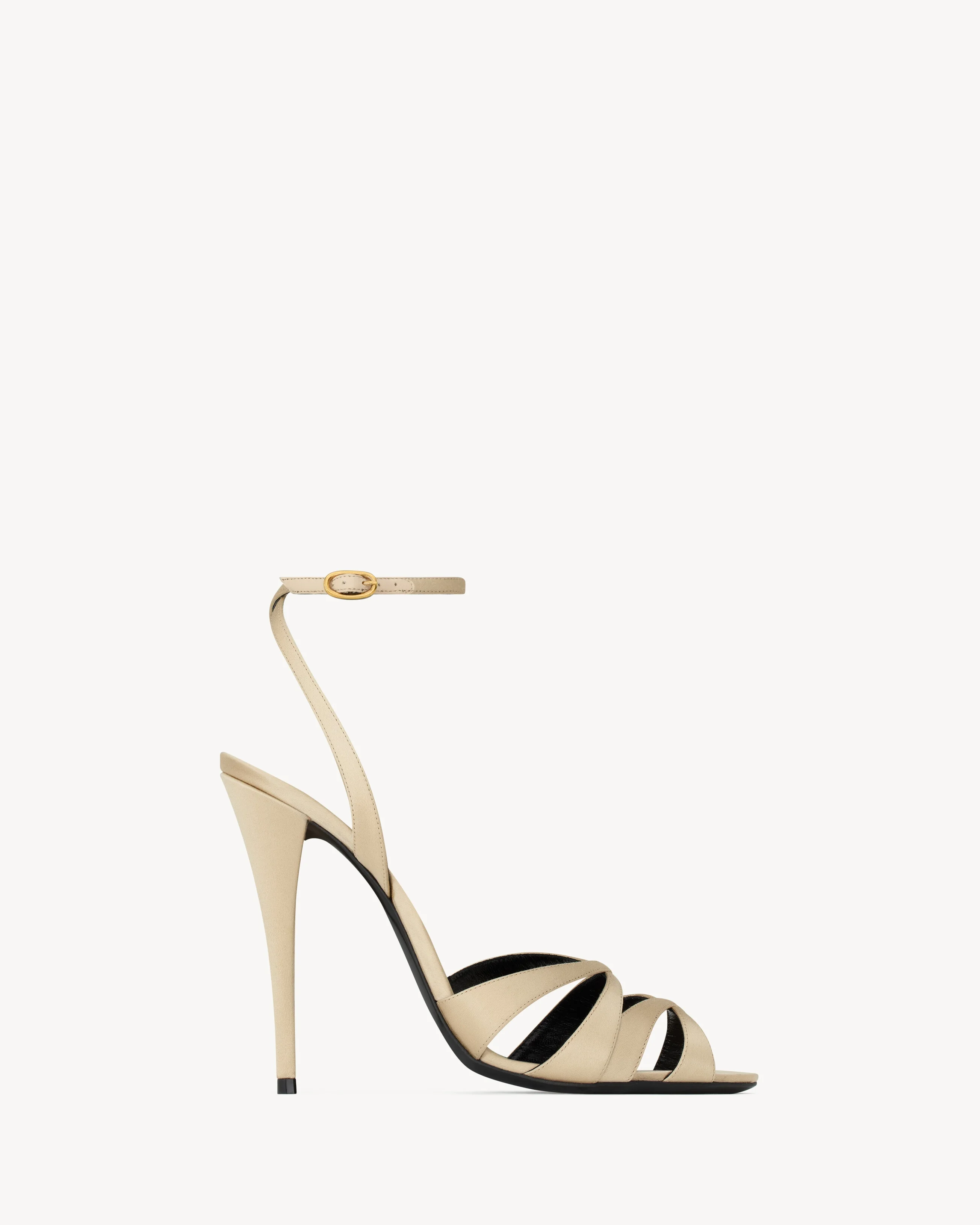 STILETTO SANDALS WITH AN ALMOND TOE, CRISSCROSSED STRAPS AND COVERED HEEL, FEATURING AN ADJUSTABLE ANKLE STRAP. - CERTIFIED VISCOSE AND SILK - LEATHER SOLE - ROUND SAINT LAURENT-ENGRAVED METAL PLAQUE ON THE INSOLE - ADJUSTABLE ANKLE STRAP - HEEL HEIGHT: 11 CM / 4.3 INCHES - 50% VISCOSE, 50% SILK - STYLE ID 8427109QNAO6817 - MADE IN ITALY