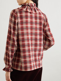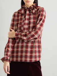 Pussy-bow ruched checked silk blouse Red
