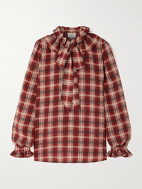 SAINT LAURENT's Pre-Fall 2025 collection is filled with vintage-style tailoring inspired by the brand's 1960s roots and the effortless look of French icon Francoise Hardy. This blouse is made from silk patterned with classic checks and has pussy-bow ties at the ruffled neckline. Size & Fit - Fits true to size, take your normal size - Cut for a slightly loose fit - Mid-weight, non-stretchy fabric - Model is 180cm/ 5'11" and is wearing a FR 36 Model measurements: - Bust: 79cm/ 31" - Waist: 60cm/ 23.5" - Hip: 86cm/ 34" Details & Care - Red, white and black silk - Button fastenings along front - 100% silk - Dry clean
