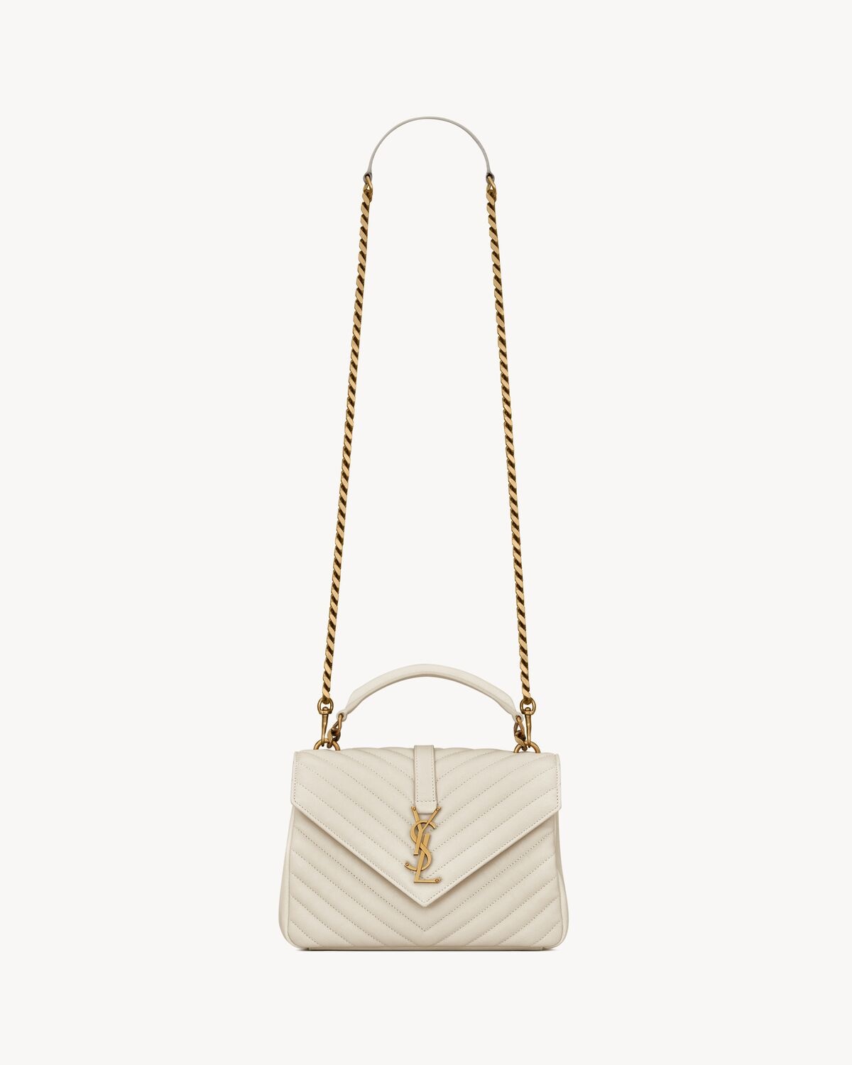LAMBSKIN SATCHEL, FEATURING ICONIC CHEVRON QUILT OVERSTITCHING AND THE CASSANDRE. COMPACT AND FUNCTIONAL, IT FEATURES A DOUBLE COMPARTMENT SEPARATED BY AN INTERIOR ZIPPED POCKET AND A LARGE BACK SLOT POCKET. DETACHABLE SWIVEL-HOOK CHAIN STRAP, SO CAN BE WORN CROSSBODY OR HELD - CHROME AND METAL-FREE TANNED LEATHER - ORGANIC COTTON LINING - LIGHT BRONZE BRASS HARDWARE - MAGNETIC SNAP TAB - ONE INTERIOR ZIPPED POCKET - DIMENSIONS: 9.4 X 6.6 X 2.5 INCHES - STRAP DROP: 2.5 INCHES - CHAIN LENGTH: 21.6 INCHES - LAMBSKIN LEATHER, BRASS - STYLE ID 600279BRM079207 - MADE IN ITALY