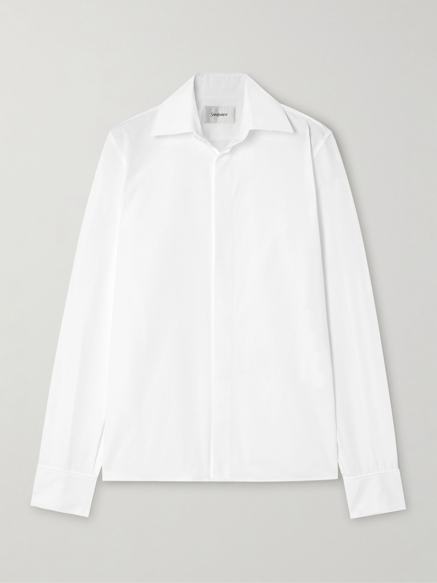 A crisp shirt offers endless styling options, so you're sure to get a lot of wear out of SAINT LAURENT's style. Made from cotton-poplin, it has a spread collar and subtle 'YSL' embroidery. Wear it with anything from a slip skirt to sharp tailoring. Size & Fit - Fits true to size, take your normal size - Tailored for a slightly loose fit - Lightweight, non-stretchy fabric - Model is 177cm/ 5'10" and is wearing a FR 36 Model measurements: - Bust: 79cm/ 31" - Waist: 61cm/ 24" - Hip: 89cm/ 35" Details & Care - White cotton-poplin - Partially concealed button fastenings through front - 100% cotton - Hand wash