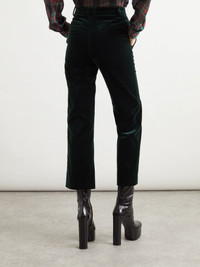SAINT LAURENT's pants are cut from plush cotton-velvet that looks and feels so elegant. They're designed to sit high on the waist and have slim legs and slightly cropped hems. Wear yours with the matching jacket from our edit. Size & Fit - Fits true to size, take your normal size - High-rise, cut for a slim fit - Cropped length - Mid-weight, non-stretchy fabric - Model is 180cm/ 5'11" and is wearing a FR 36 Model measurements: - Bust: 79cm/ 31" - Waist: 60cm/ 23.5" - Hip: 86cm/ 34" Details & Care - Dark-green cotton-velvet - Button and concealed zip fastening at front - 100% cotton - Dry clean