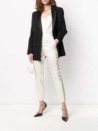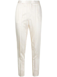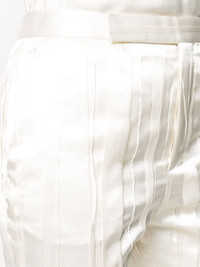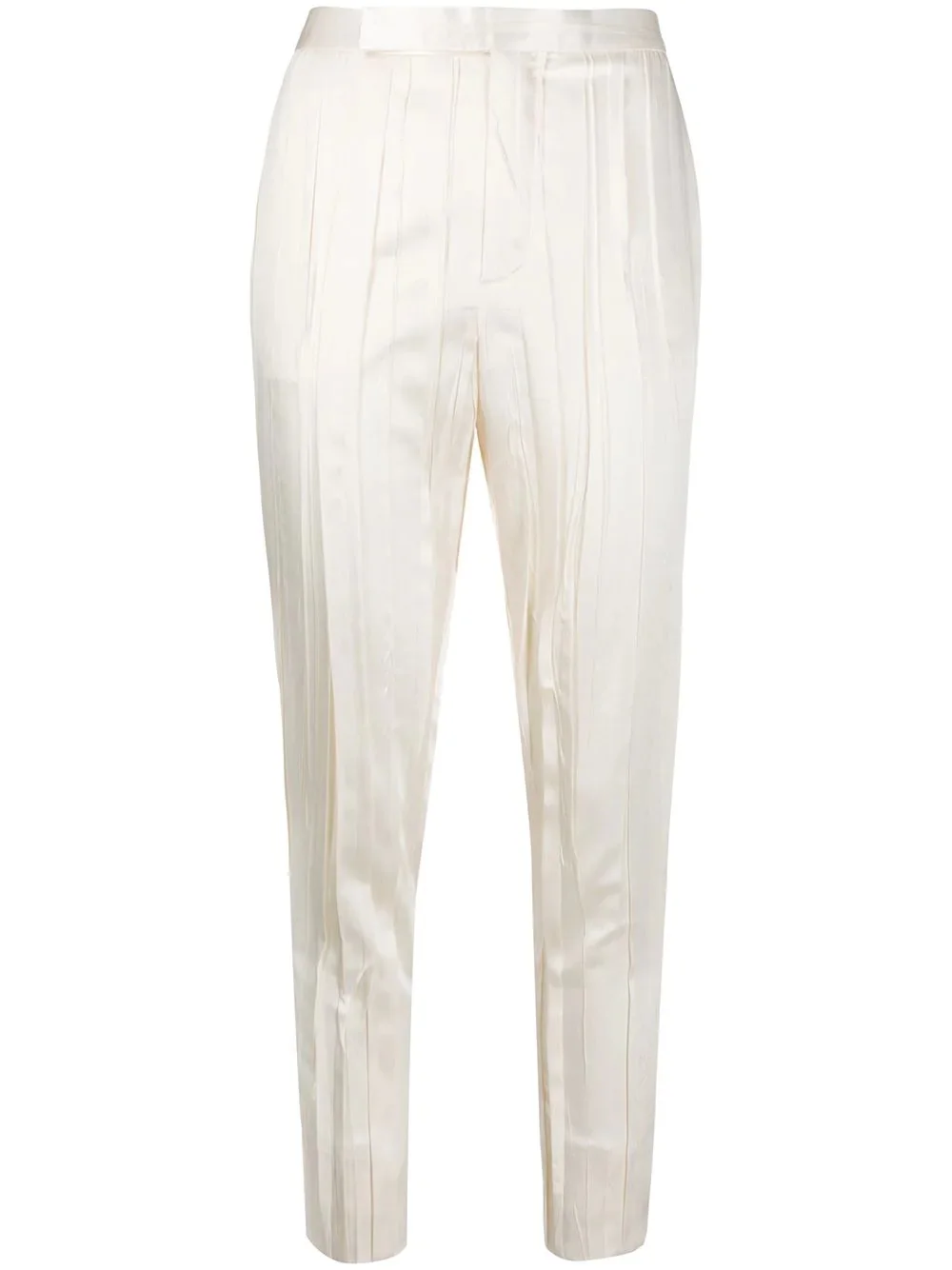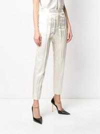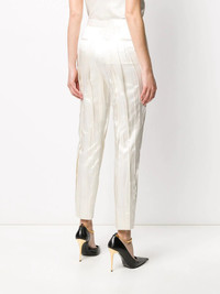 crinkle-effect tailored trousers You'll catch us wearing this ivory-white silk-blend crinkle-effect tailored trousers from Saint Laurent while shopping in Avenue des Champs-Elysees wearing red lipstick, a baguette in our hand and never wanting to leave. A bientot. Featuring a high waist, a concealed front fastening, side slit pockets, rear welt pockets, a slim fit, a cropped length and a crinkle-effect all-over. Made in Italy Composition Outer: Silk 87%, Polyester 13% Lining: Silk 100% SIZE & FIT Model measurements Height 5 ft 9 in(1.74 m) Bust/Chest 32.28 in(82 cm) Hips 35.82 in(91 cm) Waist 24.01 in(61 cm) FittingInformation This piece fits true to size. We recommend you get your regular size Cut for a slim fit Made with a mid-weight non-stretch fabric Washing instructions Dry Clean Only