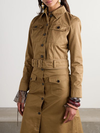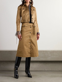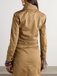 SAINT LAURENT’s jacket channels a utility look with a Parisian spin. Tailored from organic cotton-twill, it has a slim fit with cargo pockets and a removable belted hem. Wear yours with a pencil skirt or equally smart pants. Size & Fit - Fits true to size, take your normal size - Designed for a slim fit - Cropped length - Mid-weight, non-stretchy fabric - Model is 177cm/ 5'10" and is wearing a FR 36 Model measurements: - Bust: 79cm/ 31" - Waist: 61cm/ 24" - Hip: 89cm/ 35" Details & Care - Sand organic cotton-twill - Button fastenings through front - 100% organic cotton; buttons: 100% horn (Buffalo)