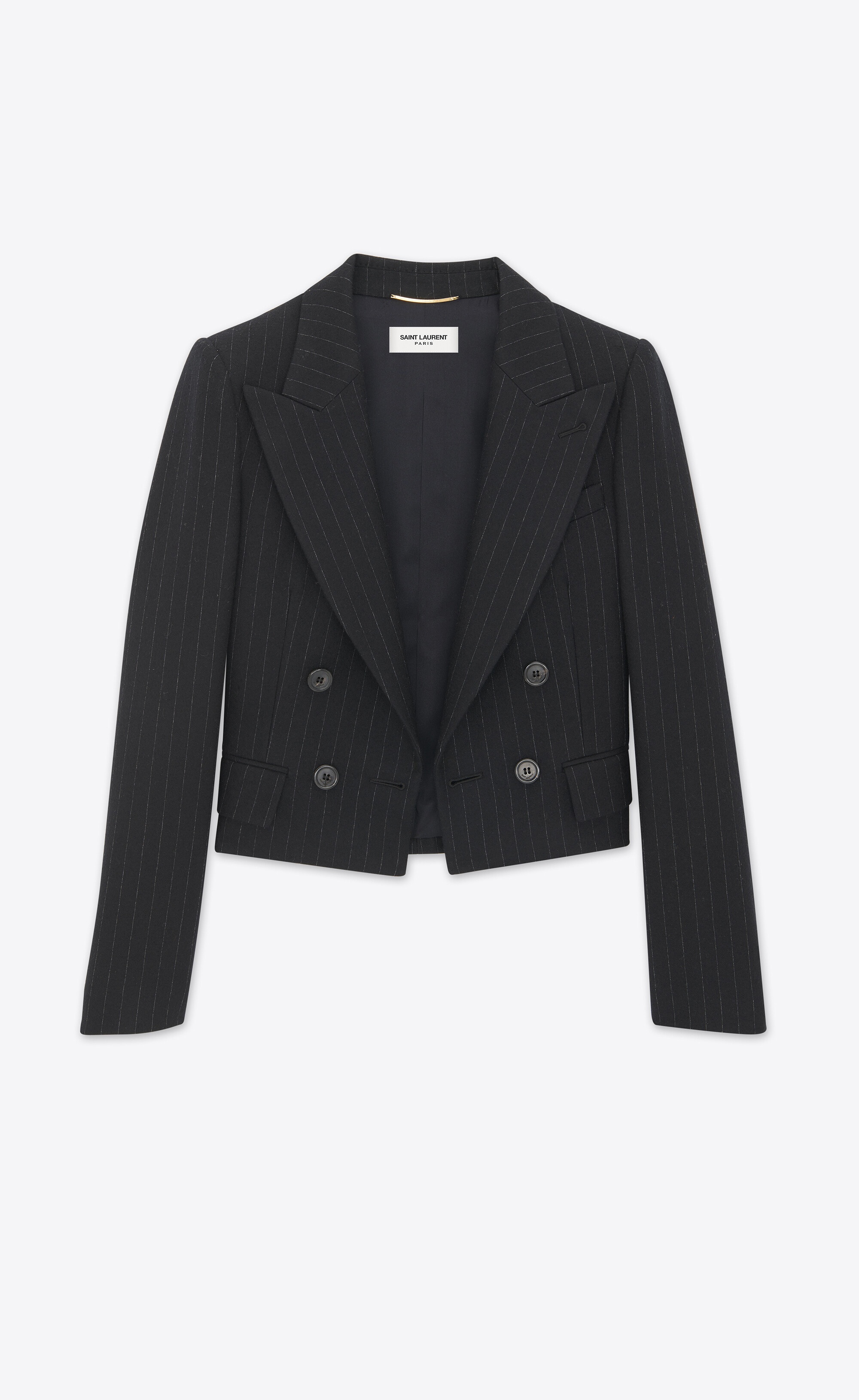 FOUR-BUTTON CROPPED JACKET MADE WITH RESPONSIBLE WOOL, FEATURING A PEAKED LAPEL AND OPEN FRONT. - 99% WOOL, 1% COTTON - RESPONSIBLE WOOL - SILK AND ELASTANE LINING - TWO JETTED POCKETS WITH FLAP AT THE FRONT, ONE WELT POCKET AT THE CHEST - TWO INNER JETTED POCKETS - PEAKED LAPEL - FOUR-BUTTON CUFFS - PADDED SHOULDERS - STYLE ID 749368Y5H301095 - MADE IN ITALY