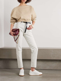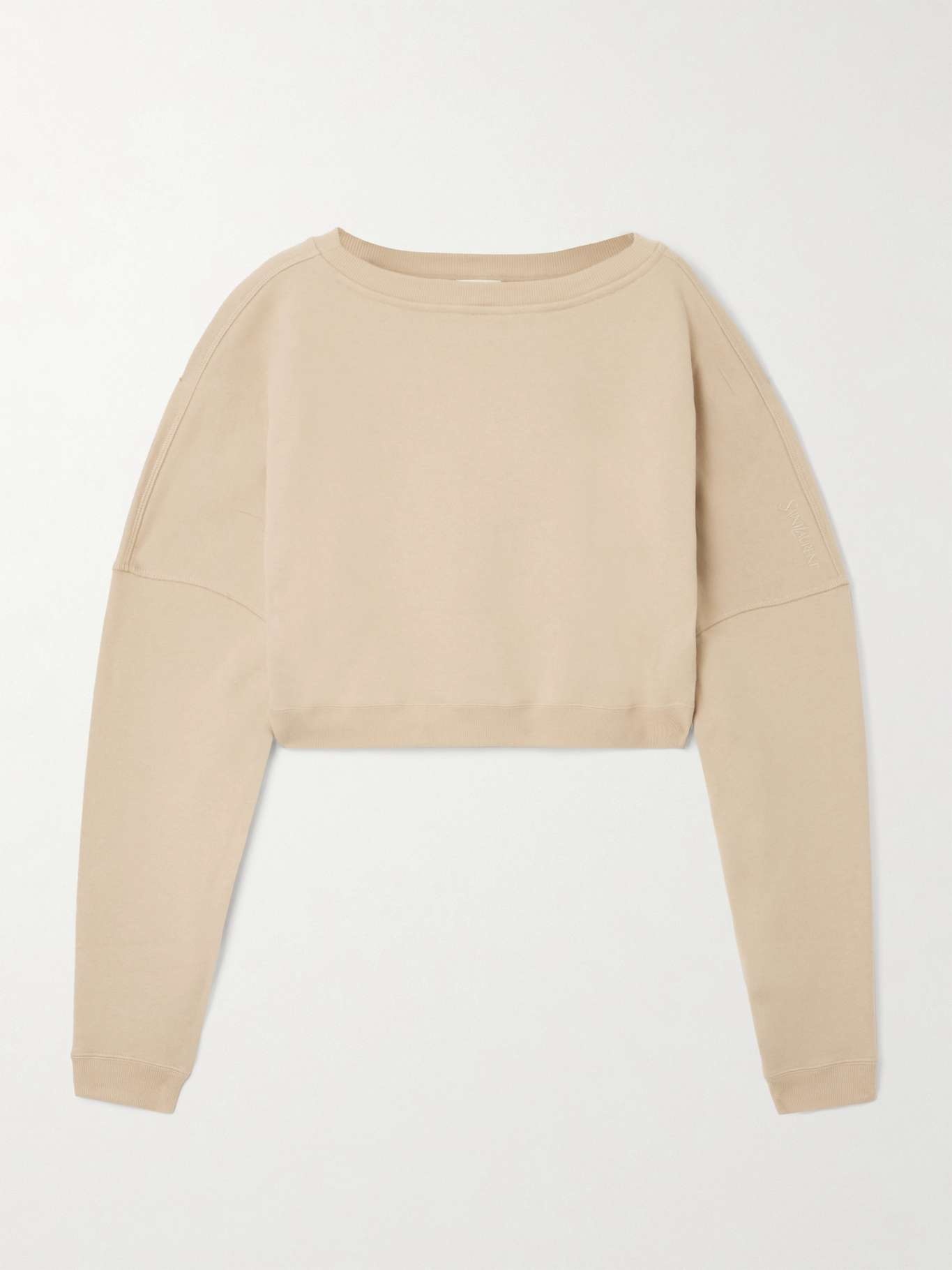 EDITORS'NOTES SAINT LAURENT's cropped sweatshirt is a throwback to styles from the '80s. It's made from soft cotton-jersey and has a wide neckline and a tonal logo embroidery at the sleeve. SIZE & FIT - Fits true to size, take your normal size - Designed for a relaxed fit - Cropped length - Dropped shoulder seam - Mid-weight, slightly stretchy fabric - Model is 180cm/ 5'11" and is wearing a size Small DETAILS & CARE - Taupe cotton-jersey - Slips on - 100% cotton - Machine wash - Designer color: Poudre