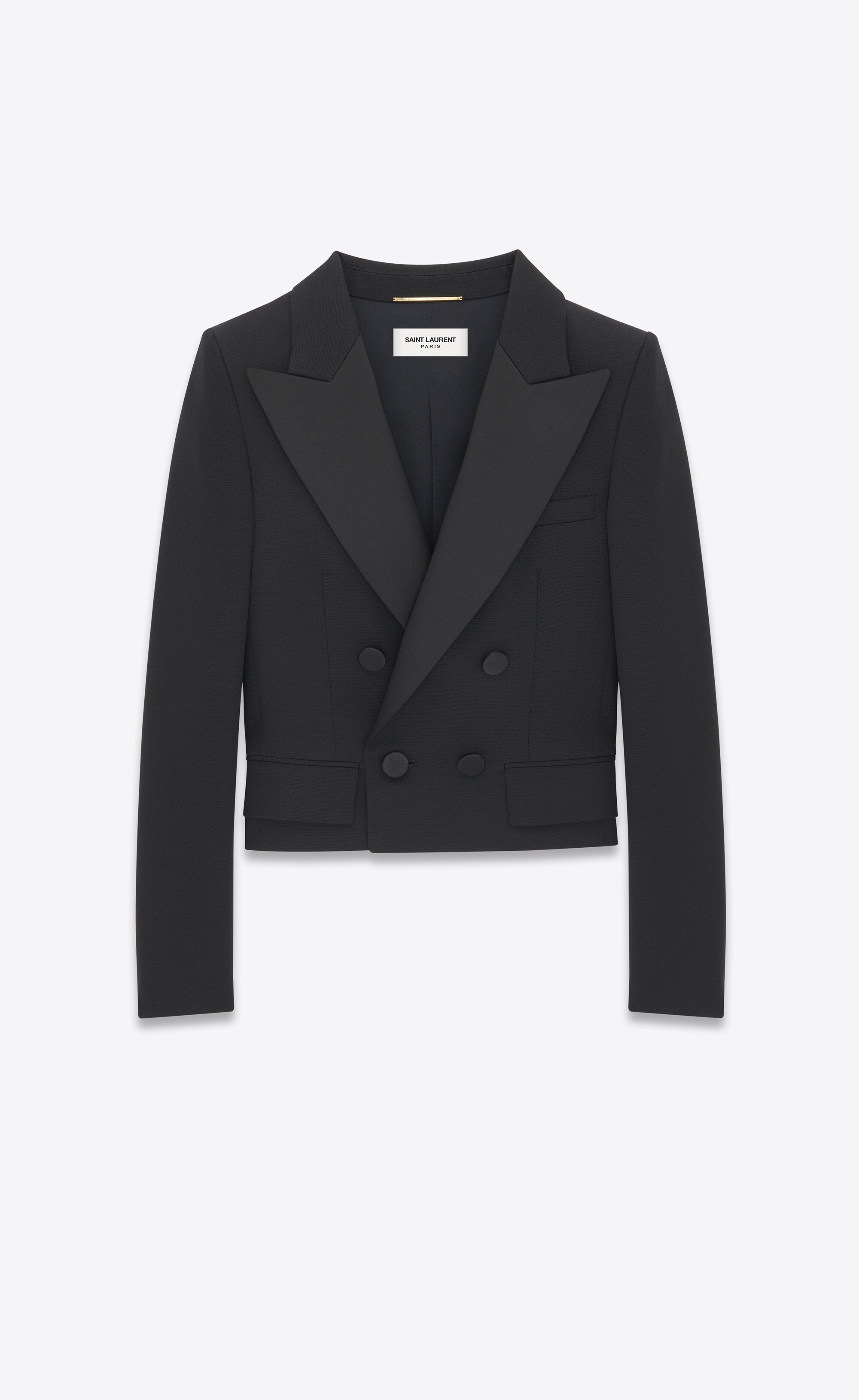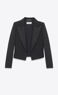 DOUBLE-BREASTED, FOUR-BUTTON CROPPED TUXEDO JACKET MADE WITH RESPONSIBLE WOOL, FEATURING A SATIN PEAKED LAPEL AND SATIN-COVERED BUTTONS. - 100% VIRGIN WOOL - RESPONSIBLE WOOL - SILK AND ELASTANE LINING - DOUBLE-BREASTED, FOUR-BUTTON CLOSURE - TWO JETTED POCKETS WITH FLAP AT THE FRONT, ONE WELT POCKET AT THE CHEST - PEAKED LAPEL - FOUR-BUTTON CUFFS - PADDED SHOULDERS - STYLE ID 759697Y512W1000 - MADE IN ITALY