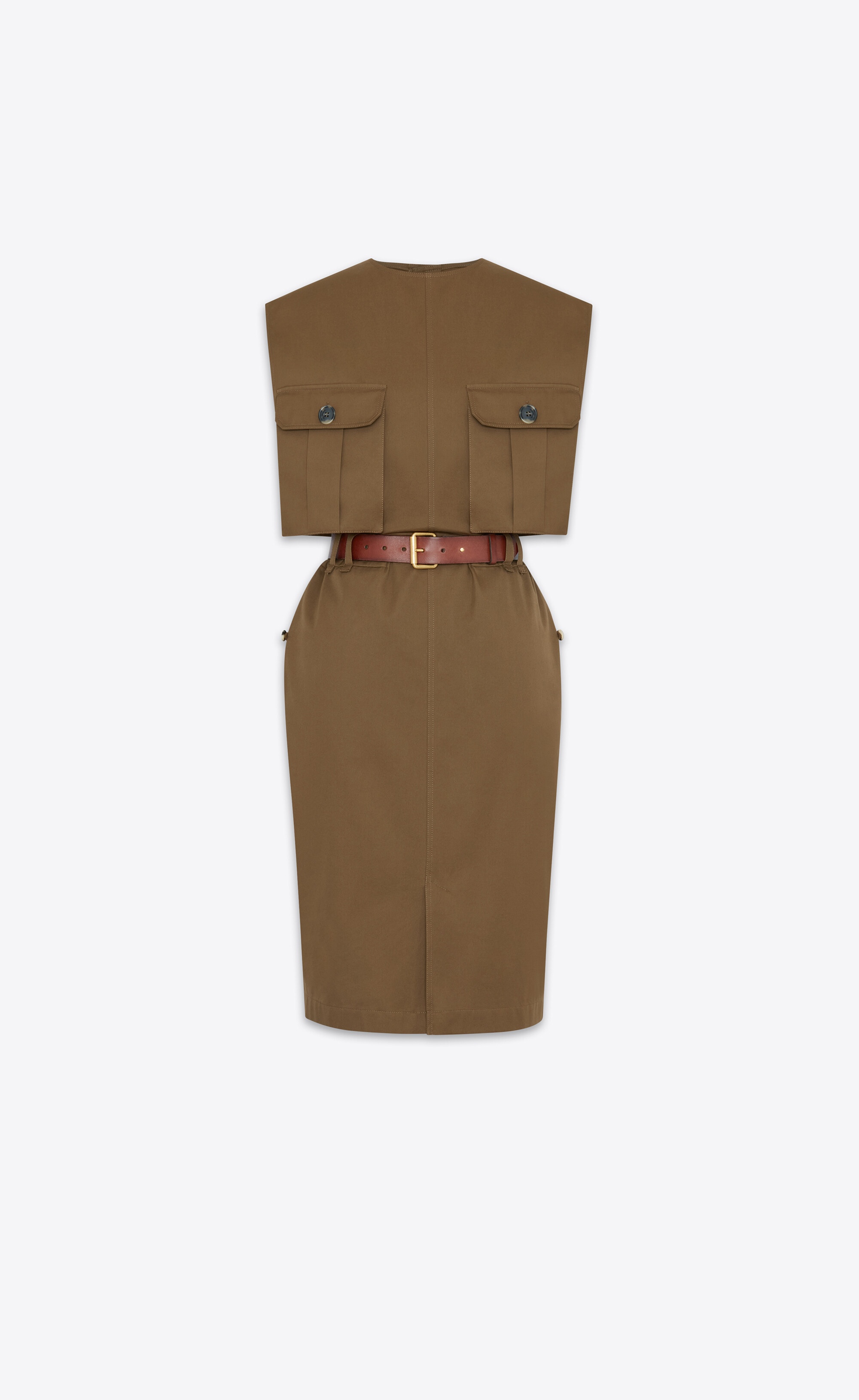 KNEE-LENGTH BELTED SAFARI DRESS MADE WITH ORGANIC COTTON, FEATURING AN OVERSIZED SLEEVELESS CREWNECK TOP WITH CUT-AWAY SIDES AND BACK, FLAP POCKETS, AND FITTED SKIRT WITH FRONT SLIT. - 100% COTTON - ORGANIC COTTON - BUTTON CLOSURE AT THE BACK NECK - CONCEALED ZIP CLOSURE AT THE BACK SKIRT - REMOVABLE PIN-BUCKLE LEATHER BELT - TWO BOX-PLEATED BELLOW POCKETS WITH BUTTON FLAP AT THE CHEST - TWO JETTED POCKETS WITH BUTTON AT THE SIDES - CREWNECK - FRONT SLIT - STYLE ID 791990Y3A992028 - MADE IN ITALY