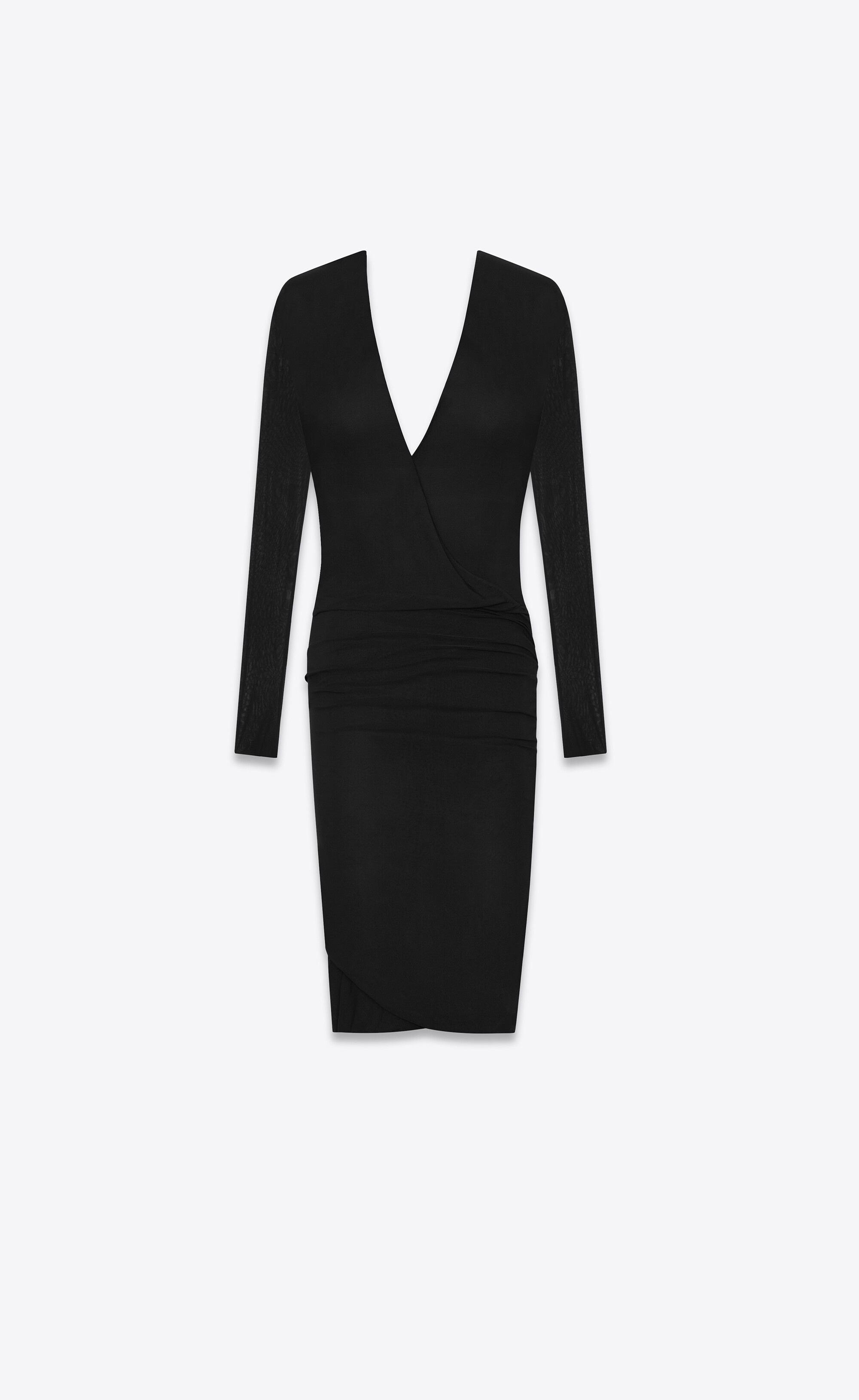 SEMI-SHEER LONG-SLEEVE PENCIL DRESS MADE WITH RESPONSIBLE VISCOSE, FEATURING A PLUNGING SURPLICE NECKLINE AND BACK, ARMSCYE CUT-OUTS AND A RUCHED SKIRT. - 100% VISCOSE - RESPONSIBLE VISCOSE - PLUNGING SURPLICE NECKLINE - STYLE ID 776448Y5G291000 - MADE IN FRANCE