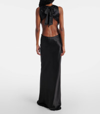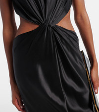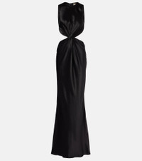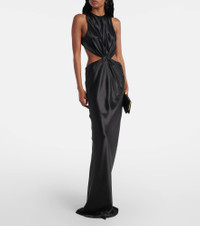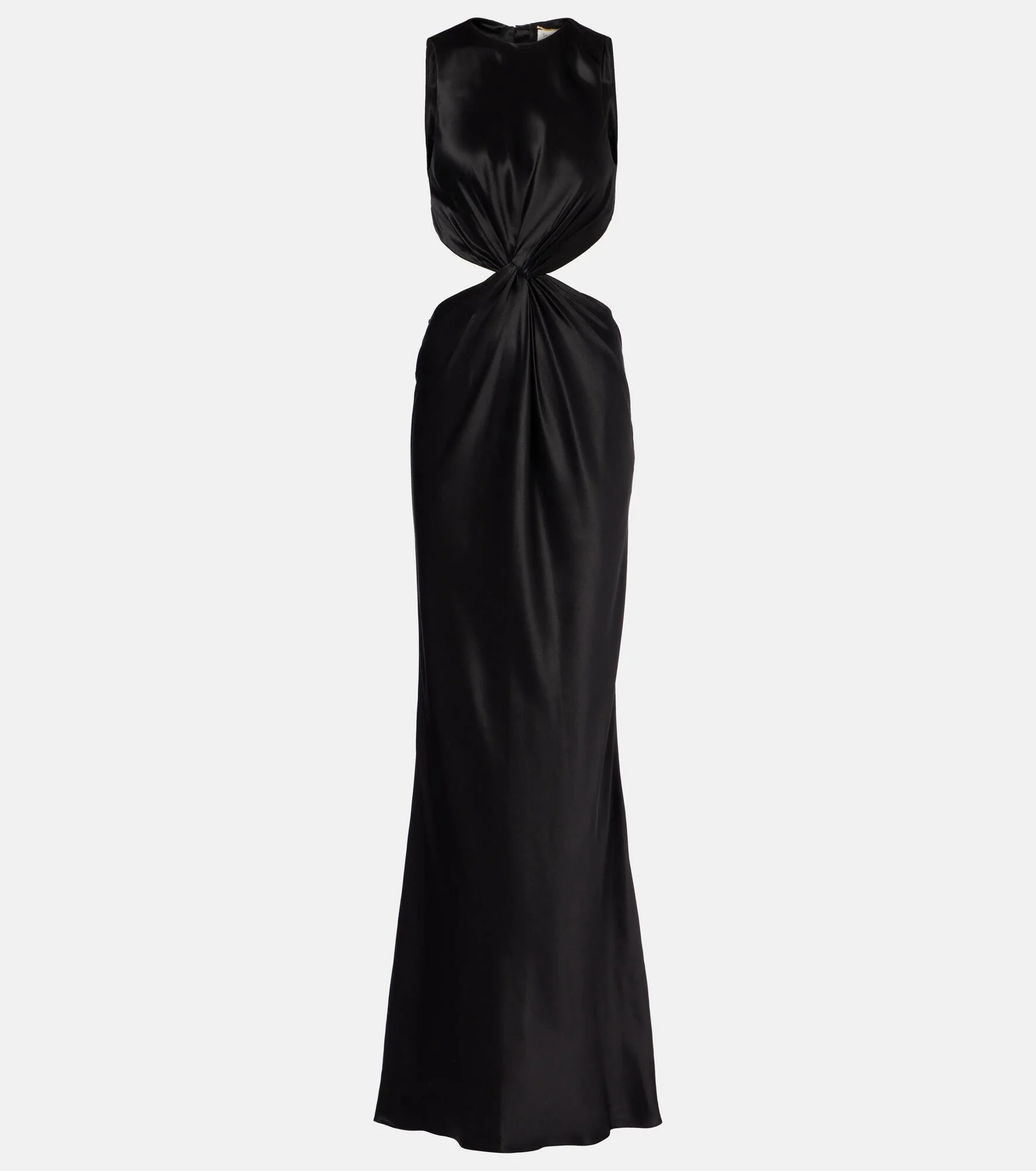 Crafted in France from silk, this Saint Laurent maxi dress features a gathered silhouette at the waist and cutout sides. Elegant and timeless, this piece is perfect for refined evening occasions. Product Details - Material: 100% silk - Care instructions: dry clean - Made in France - Designer color name: Noir - Item color: black - Lining: 100% silk - Closure: zipped back, hook-fastening back - Fully lined - Item number: P01032201 Size & Fit - True to size - Sizing adapted to taller women - Low back - Fitted - Non-stretchy fabric - The model seen in the picture is 178cm-5'10", cup size %cupsize%, and wearing a size FR 34