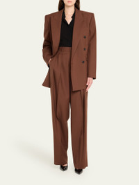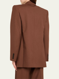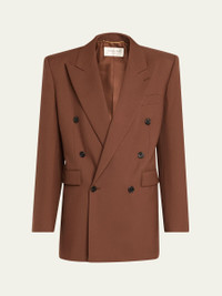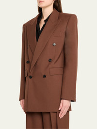 Saint Laurent blazer jacket structured with padded shoulders Peak lapels; double-breasted front Long sleeves; button cuffs Chest welt pocket Hip flap pockets Straight fit Hem falls below the hip Wool/silk/cotton Made in Italy Online Inquiries: BGS21_B9Y02| Store Inquiries: #4998270